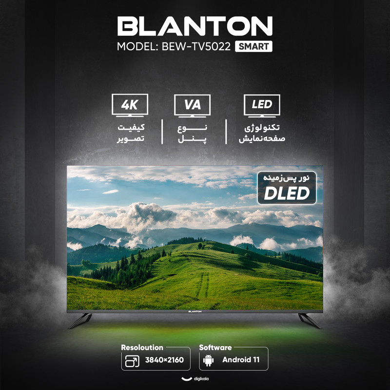 تلویزیون 50 اینچ بلانتون مدل BEW-TV5022 یک گزینه جذاب و کاربردی برای خانههای امروزی است. این تلویزیون با کیفیت تصویر4K و رزولوشن 3840×2160، تصاویری شفاف و زنده تولید میکند. جزئیات تصویر کاملاً واضح هستند و تماشای فیلم و برنامههای مورد علاقهتان با آن لذتبخش میشود. نسبت تصویر 16:9 و پنل VA باعث میشود که رنگها طبیعی و عمق تصویر بالا باشند. نرخ بهروزرسانی تصویر 60 هرتز است و تصاویر با سرعت مناسب و بدون پرش نمایش داده میشوند. نور پسزمینه DLED هم کیفیت تصویر را در محیطهای مختلف به خوبی حفظ میکند. از نظر صدا، این تلویزیون با توان خروجی 20 وات و فناوریهای Dolby Digital و DTS صدایی واضح و فراگیر پخش میکند. حتی بدون استفاده از اسپیکرهای جانبی هم میتوانید از کیفیت صدای خوب آن لذت ببرید. خروجی صدای اپتیکال هم برای اتصال به سیستمهای صوتی حرفهای در نظر گرفته شده است. بلانتون BEW-TV5022 یک تلویزیون کاملاً هوشمند است. سیستم عامل Android نسخه 11 روی آن نصب شده است و به شما امکان میدهد به اینترنت وصل شوید، برنامههای مختلف را اجرا کنید و حتی از مرورگر وب استفاده کنید. این تلویزیون از وایفای، بلوتوث و قابلیتScreen Mirroring پشتیبانی میکند و کنترل آن با ریموت هوشمند بسیار ساده و راحت است. ریموت کنترل این مدل در عین حال قابلیت استفاده از موس هم دارد و کار شما را آسان میکند تا روی صفحه راحتتر جابجا شوید. این تلویزیون دارای سه درگاه HDMI و دو درگاه USB است که برای اتصال دستگاههای مختلف مثل کنسول بازی، فلش مموری و لپتاپ مناسباند. درگاه LAN هم برای اتصال مستقیم به اینترنت در نظر گرفته شده است. گیرنده دیجیتال داخلی به شما امکان میدهد شبکههای تلویزیونی را بدون نیاز به دستگاه اضافه دریافت کنید. از دیگر امکانات کاربردی این تلویزیون میتوان به جدول پخش برنامهها، قابلیت Time Shift، قابلیت ضبط برنامه، تلهتکست و منوی فارسی اشاره کرد. همه این قابلیتها باعث میشوند که استفاده از تلویزیون برای همه اعضای خانواده ساده و لذتبخش باشد. تلویزیون بلانتون 50 اینچ طراحی ساده و مدرنی دارد. صفحه تخت با پایههای دو شاخه ظاهر زیبایی به آن بخشیده است. ابعاد این مدل بدون پایه 1115x646x95 میلیمتر است و وزن آن حدود 9.68 کیلوگرم است.