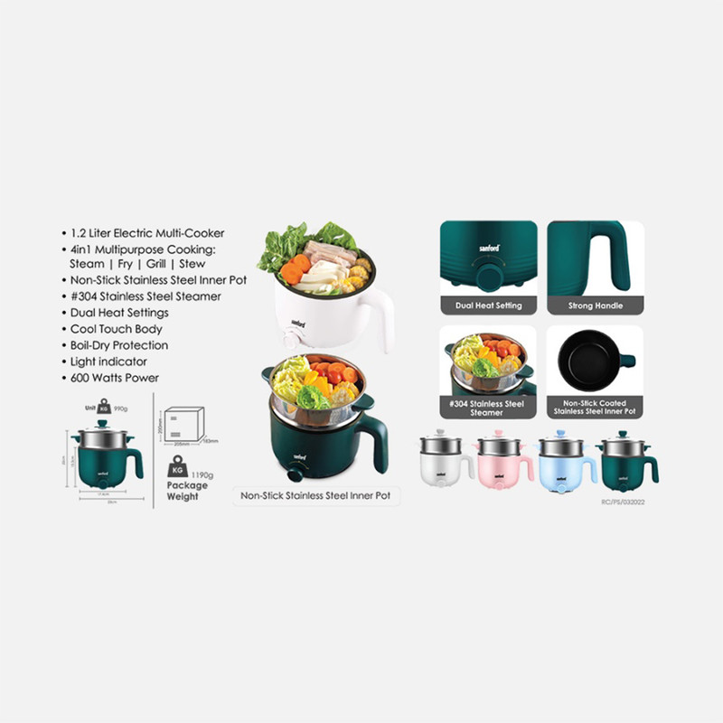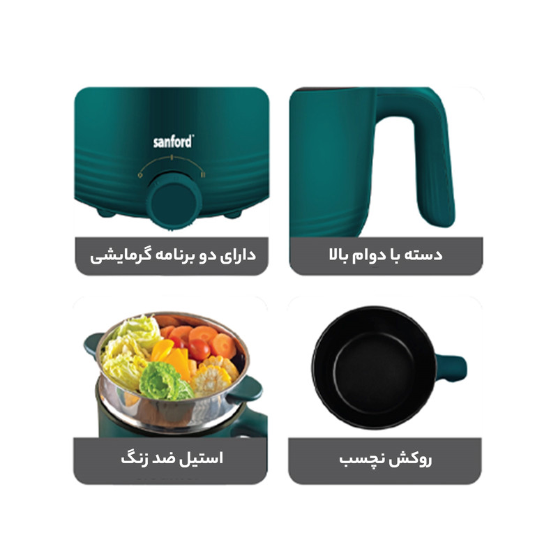 دستگاه مولتی کوکر مدل SF1158MC دارای 4 عملکرد مختلف یعنی قابلمه پلو پز ، سرخ کن، بخارپز و گریل است. این عملکرد 4گانه شما را قادر می سازد فضای آشپزخانه را آزاد کنید و انواع قابل توجهی از غذاها با مجموعه متنوعی از دستور پخت را بپزید. این دستگاه همچنین دارای دسته محکم و بدنه عایق و خنک در هنگام استفاده است. برای ایمنی و راحتی، درب شیشه ای از شیشه سفت ساخته شده است که حرارت را در قابلمه حفظ می کند و به شما امکان می دهد پیشرفت پخت و پز خود را مشاهده کنید. قابلمه داخلی با ظرفیت 1/2لیتر دارای روکش نچسب برای جلوگیری از چسبیدن غذا به سطح قابلمه در طول فرایند پخت است که امکان سرو آسان و تمیز کردن سریع دستگاه را فراهم می کند.همچنین وجود دو سطح دمایی امکان تنظیم دما برای تنظیم زمان پخت را فراهم میکند. طراحی جمع و جور نگهداری آن را آسان کرده و آن را برای آشپزخانه های کوچکتر ایده آل می کند.