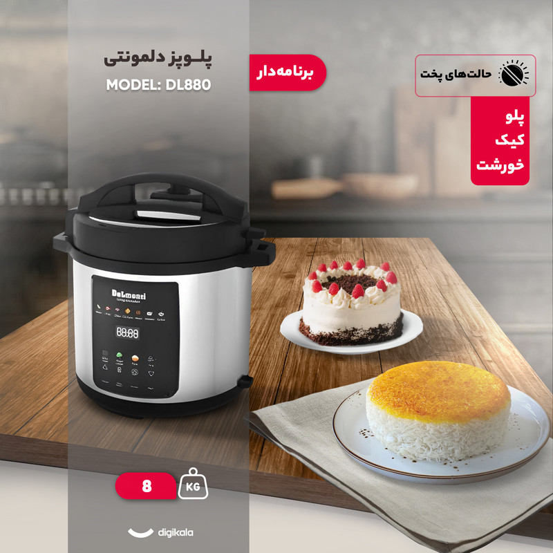 پلوپز ۸ نفره دلمونتی مدل DL880 یکی از محصولات مدرن و پرظرفیت این برند است که برای خانوادههای پرجمعیت یا علاقهمندان به مهمانیهای خانوادگی طراحی شده است. این دستگاه با ظرفیت ۸ لیتر، توان مصرفی ۱۲۰۰ وات و قابلیت پخت برای ۸ نفر، بهراحتی میتواند نیاز یک خانواده بزرگ را در پخت غذاهای متنوع برطرف کند.