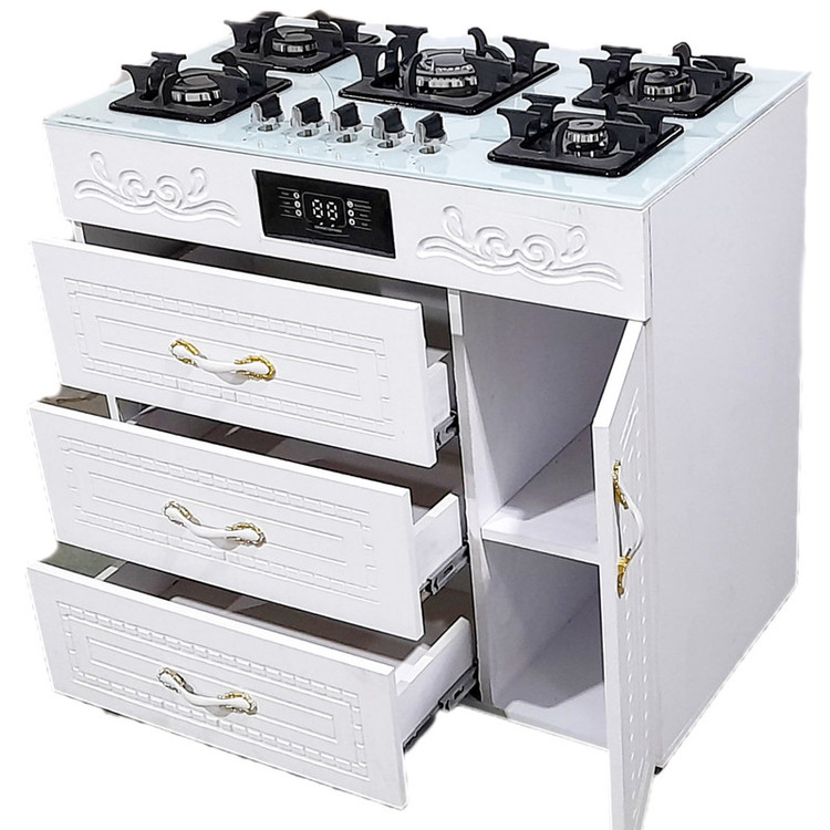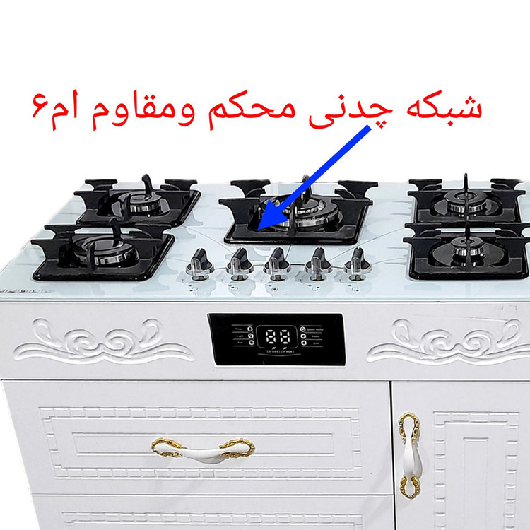 اجاقگاز کابینتی روشیشه سکوریت محکم ومقاوم دربرابر شوک حرارتی یک درب سه کشو فندک وجرقه زن برقی وپایه تنظیم ارتفاع شبکه چدنی سنگین ومقاوم ام 6 مجوز رسمی کشوری