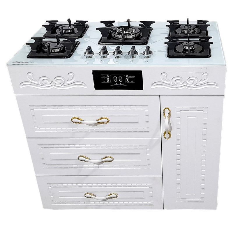 اجاقگاز کابینتی روشیشه سکوریت محکم ومقاوم دربرابر شوک حرارتی یک درب سه کشو فندک وجرقه زن برقی وپایه تنظیم ارتفاع شبکه چدنی سنگین ومقاوم ام 6 مجوز رسمی کشوری
