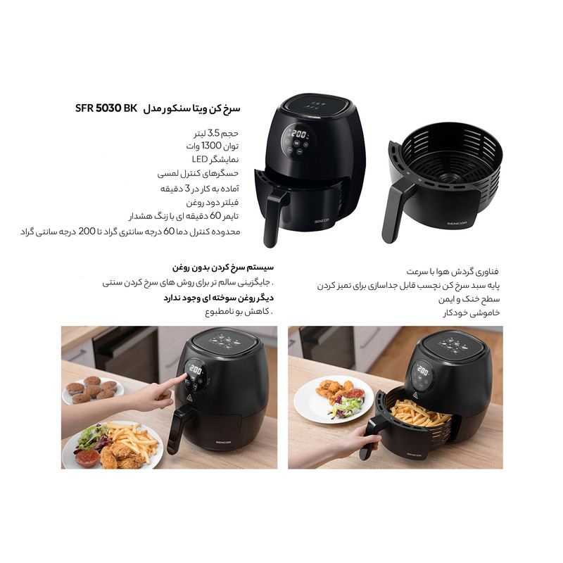 دستهبندی: سرخ کنابعاد: 35x30x40 سانتیمتروزن: 4.5 کیلوگرمطول سیم: 160 سانتی مترنوع سرخ کن: هواپز (بدون روغن)