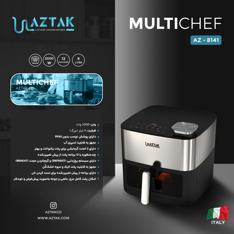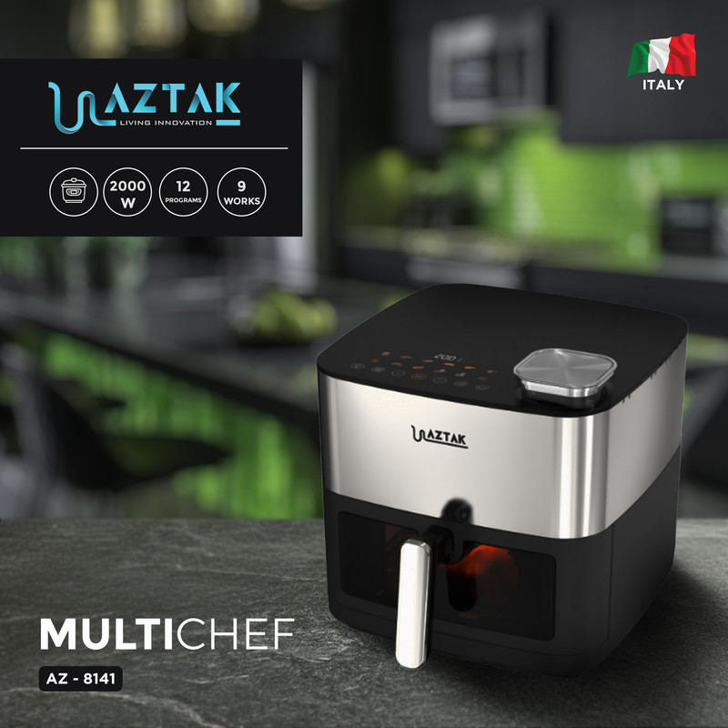سرخکن بدون روغن آزتک مدل 8141 ساخت کشورهای بازار مشترک(PRC) و تحت لیسانس ایتالیا، دستگاهی کاربردی و با قابلیتهای متنوع است. این ابزار یکی از وسایل محبوب آشپزخانه محسوب میشود و با امکان سرخ کردن بدون روغن، غذاهایی سالم با کمترین میزان چربی تهیه میکند. این ویژگی برای افرادی که رژیم غذایی دارند یا گیاهخوار هستند، امکان پخت غذاهای کمکالری و سبک را فراهم میکند.این دستگاه دارای قفل کودک و امکان هشدار پخت کامل خودکار است. دمای دستگاه بین ۸۰ تا ۲۰۰ درجه سانتیگراد قابل تنظیم است. قابلیتهای یخزدایی، گرم نگه داشتن غذا، گریل کردن و سرخ کردن از دیگر امکانات آن هستند. سبد نچسب و ضدخش بوده و قطعات آن قابل شستوشو در ماشین ظرفشویی هستند. دستگاه دارای دو المنت گرمایشی برای پخت یکنواخت و بهتر هست .همچنین دارای 12 برنامه پخت از پیش تعیین شده، برنامه یخزدایی و گرمکردن غذا، مجهز به قابلیت پخت کیک و میوه خشک کن ،دارای برنامه از پیش تعین شده برای تست کردن نان،امکان پخت کامل مرغ ،ماهی ،جوجه بصورت پیش فرض و خودکار،مجهز به قابلیت اسپری آب،تکنولوژی Rapid Air (جلوگیری از بو و گردش سریع هوا) و فناوری پخش سریع و یکنواخت حرارت در محفظه غذا است. همچنین امکان ذخیره دستور پخت شخصی برای استفاده مجدد وجود دارد. این سرخکن کاهش مصرف روغن، تنظیم دما و زمان متناسب با غذای در حال پخت، پخت یکنواخت و سالم و حفظ مواد مغذی غذا را فراهم میکند.