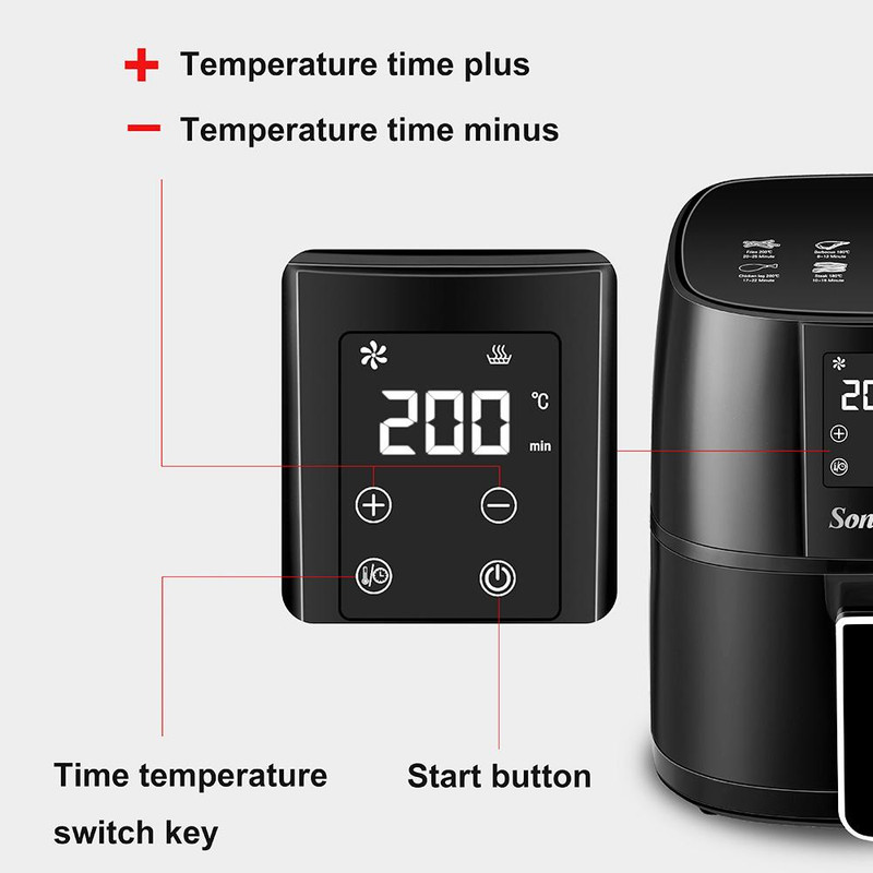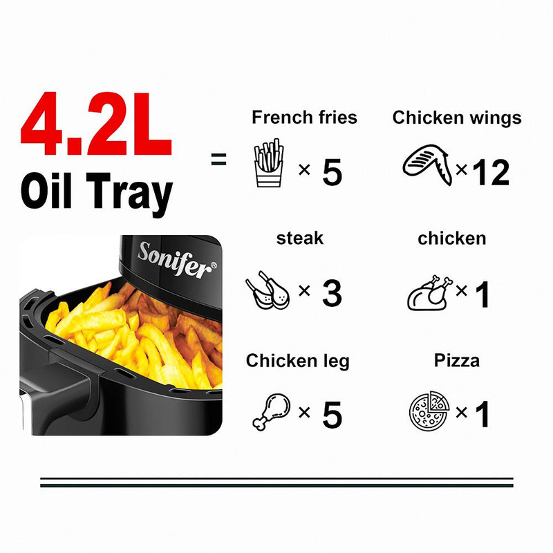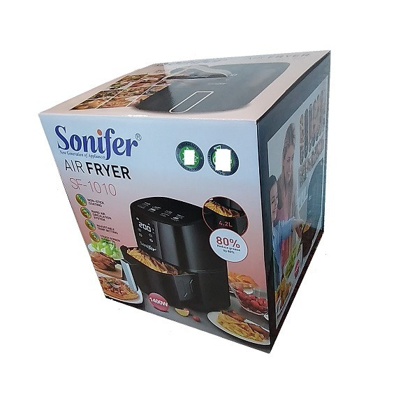 سرخ کن بدون روغن دیجیتال سونیفر( اصل چین ) مدل SF-1010 با توان 1400 وات و ظرفیت 4.2 لیتری یکی از جدیدترین سرخ کن های بدون روغن شرکت سونیفر میباشد و جز سرخکن های پر متقاضی است که برای خانوار با تعداد 2 الی 4 نفر مناسب است . قابلیت تنظیم دما تا 200 درجه سانتی گراد و پیشنهاد زمان پخت برای مواد غذایی متنوع وچرخش هوای 360 درجه و کاهش 80 درصدی مصرف روغن از دیگر مشخصات این محصول می باشد..این دستگاه قابلیت سرخ کردن انواع مواد غذایی را با کمترین کالری را همچون مرغ سوخاری،سیب زمینی،استیک،جوجه سرخ شده، میگو،پیتزا ، و.... داراست.