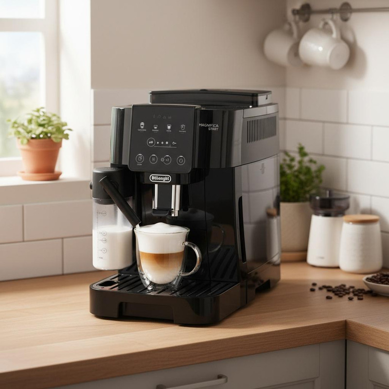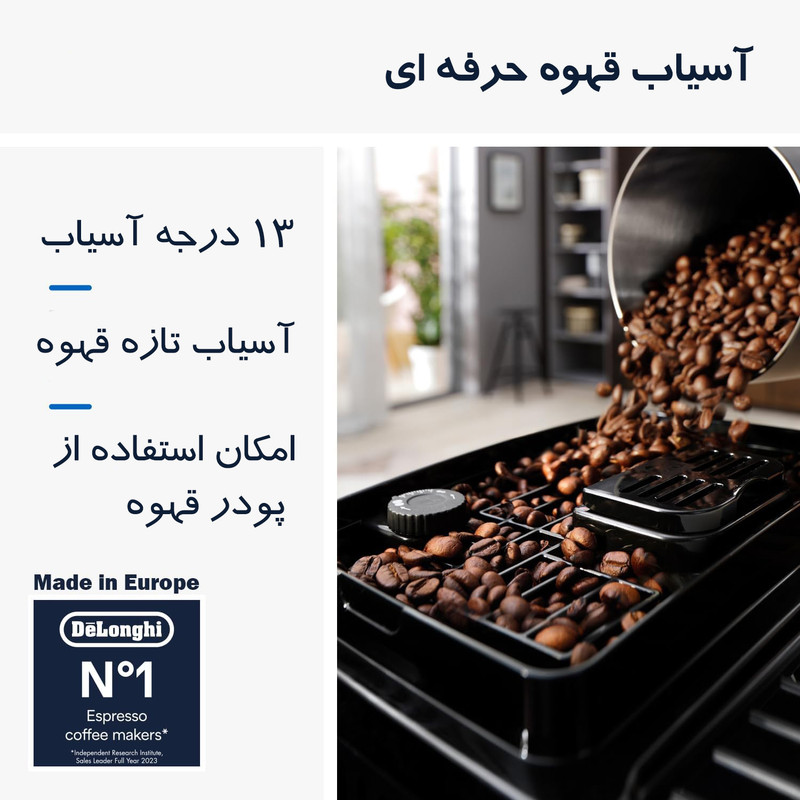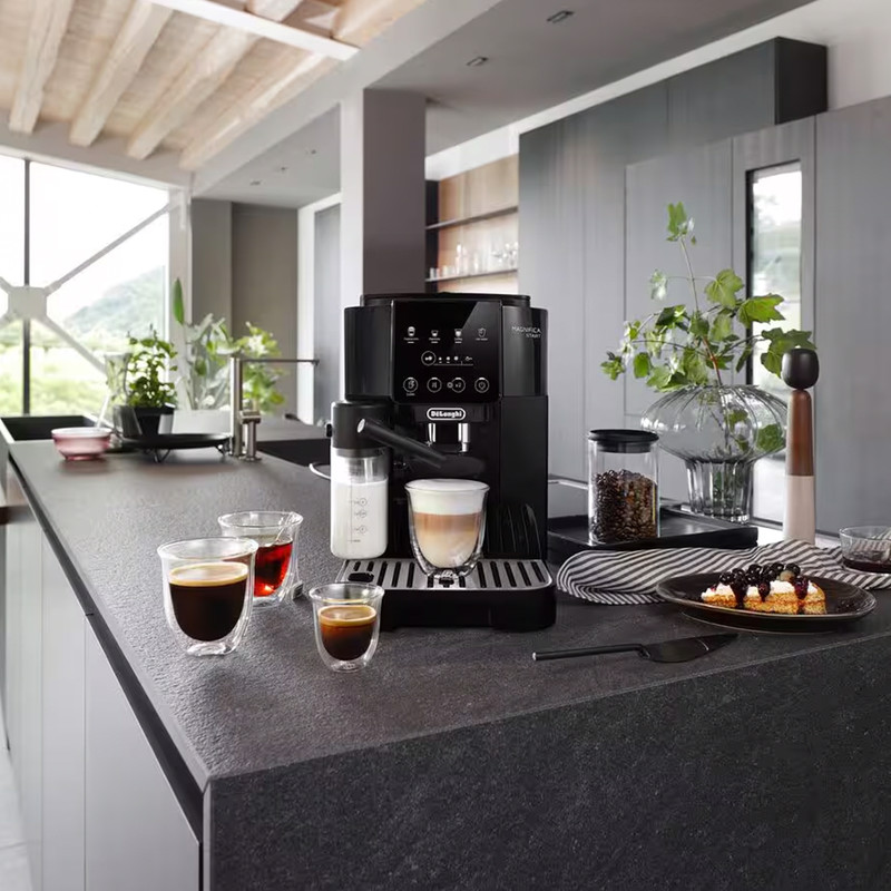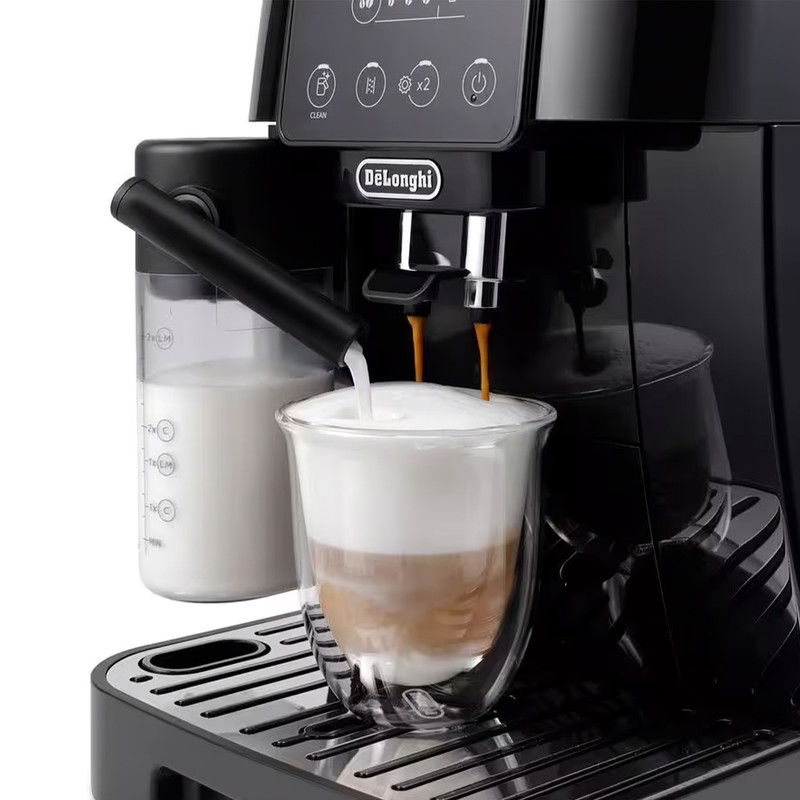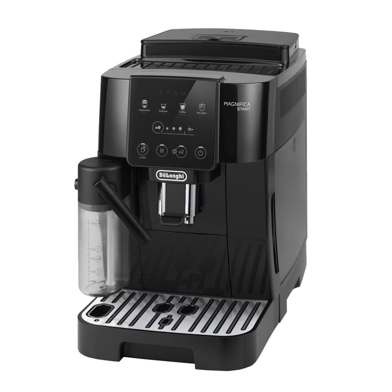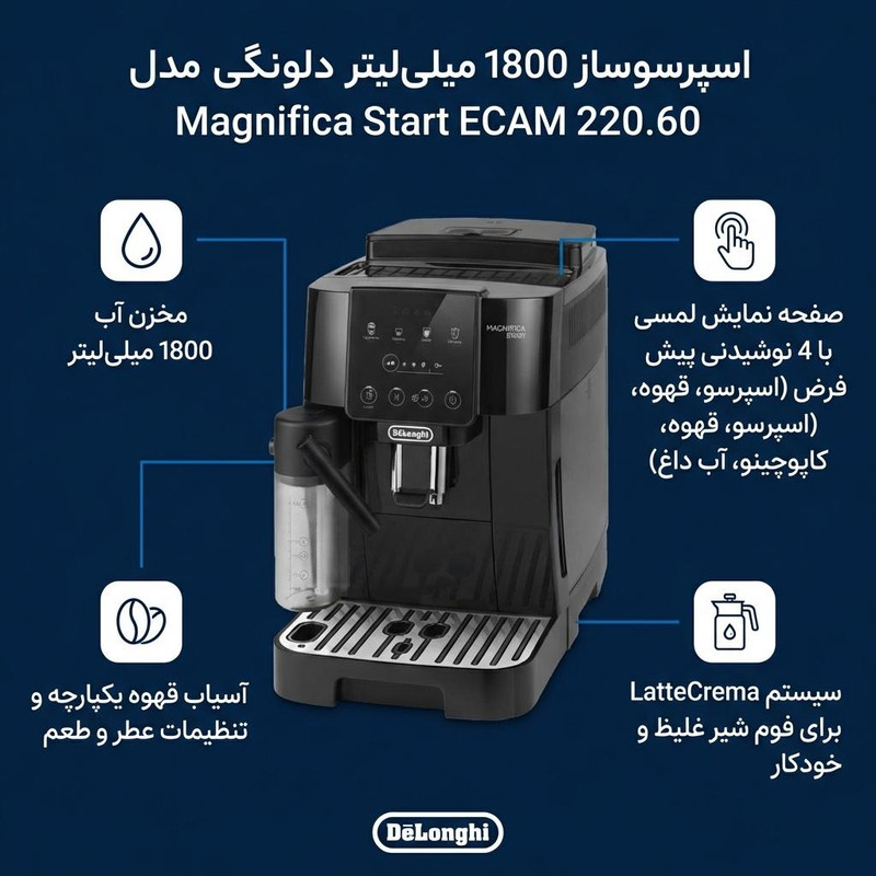 اسپرسوساز دلونگی مدل Magnifica Start ECAM 220.60 یک دستگاه فول اتوماتیک با قابلیت آسیاب قهوه و فوم سازی اتوماتیک بوده و به بهترین شکل امکان تهیه اسپرسو و نوشیدنی های بر پایه شیر نظیر لاته و کاپوچینو را فراهم میکند. طراحی شیک و مدرن این اسپرسوساز با رنگ مشکی آن جلوهای ویژه به فضای اطراف میدهد. آسیاب 13 حالته دستگاه قهوه را در اندازه های مناسب شما آسیاب و تازه ترین عطر قهوه را استخراج میکند و به لطف فناوری انحصاری LatteCrema Hot دلونگی و با توان 1450 وات و فشار بخار 15 بار دستگاه، کاپوچینو و لاته ماکیاتو با بهترین شکل و کیفیت آماده میگردد. مخزن دان قهوه دستگاه 250 گرم ظرفیت و مخزن آب نیز 1.8 لیتر گنجایش دارد. سرعت بالای تهیه قهوه این دستگاه به شما کمک میکند تا در زمان کمتری نوشیدنیها را تهیه کنید. دستگاه دارای 2 خروجی نازل قهوه با امکان تنظیم ارتفاع تا 14 سانتیمتر و همچنین یک نازل شیر برای تهیه فوم شیر است. مخزن شیر برای تولید کف شیر غلیظ و باکیفیت است و همچنین قابلیت جدا شدن و نگهداری در یخچال را دارد. فیلتر آب در نظر گرفته شده برای این اسپرسوساز کمک می کند تا نوشیدنی هایتان طعم بهتر و طبیعی تری داشته باشند. دیگر ویژگی خوب این محصول شخصی سازی عطر و طعم نوشیدنی ها است تا طبق علاقه خود و بدون تنظیمات در هر دفعه نوشیدنی مورد نظرتان را دریافت کنید.