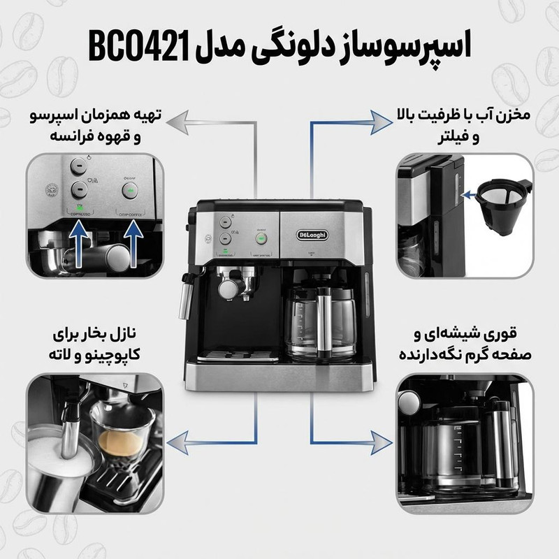 اسپرسو ساز دلونگی مدل BCO421 یکی از بهترین انتخاب ها برای طرفداران قهوه می باشد. این دستگاه قابلیت تهیه اسپرسو، کاپوچینو و قهوه فوری را در خانه یا محل کار شما فراهم می کند. با قدرت 1100 وات، طراحی زیبا و کاربردی و نمایشگر دیجیتال، شما به سرعت و به سهولت می توانید قهوه مورد علاقه خود را تهیه کنید. این دستگاه دارای مخزن آب به ظرفیت 1.2 لیتر می باشد که به شما امکان تهیه چندین فنجان قهوه را در یک بار داده است. همچنین دارای مخزن قهوه و کاپوچینو به ظرفیت 200 گرم و همچنین قابلیت تنظیم شدت قهوه و حتی اندازه بخار برای تهیه کاپوچینو است. با صفحه نمایش دیجیتال و دکمه های آسان، این دستگاه بسیار ساده در استفاده است و با بدنه ضد زنگ، آن را می توان به راحتی تمیز کرد. با وجود تمام این ویژگی ها، قیمت این دستگاه نیز بسیار مناسب است که برای خانوادهها و کسانی که به دنبال یک دستگاه با کارایی بالا و کیفیت مناسب هستند، پیشنهاد می شود.