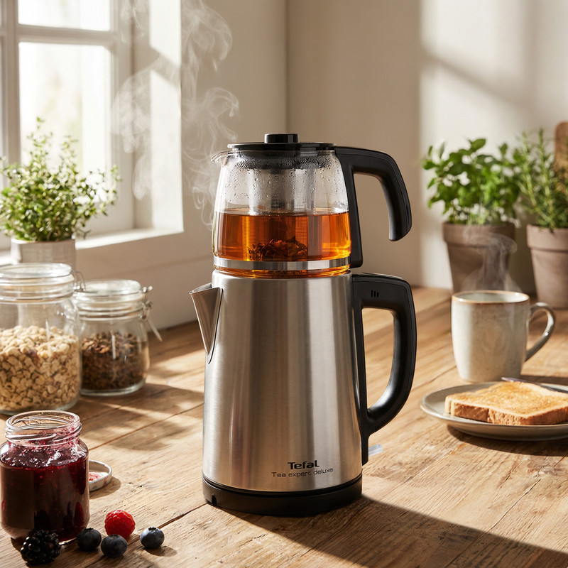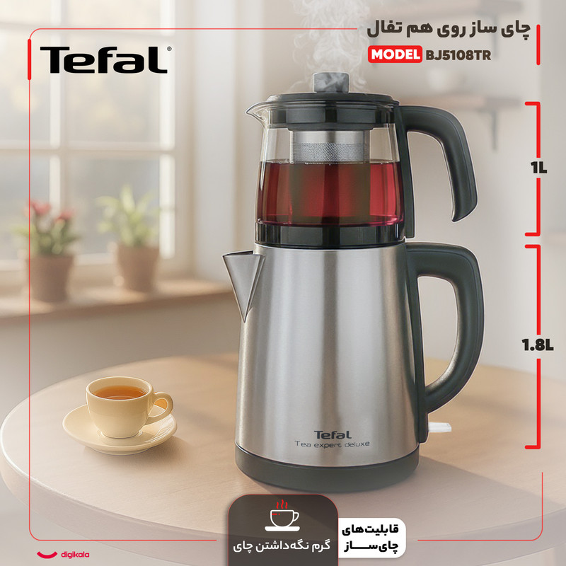 اگر به نوشیدن چای علاقه دارید باید چای ساز تهیه کنید. چای ساز تفال مدل BJ5108TR یک چای ساز جمع و جور است. این مدل قوری، کتری دارد. . ظرفیت کتری آب این مدل 1.8 لیتر است. برای کتری این مدل از جنس استیل و قوری از شیشه استفادهشده است. استفاده از شیشه باعث شده تا بتوانید محتویات درون قوری را ببینید و نیازی باز کردن درب نداشته باشید. این مدل یک پنل دیجیتالی برای اعمال تنظیمات دارد. قوری و کتری این مدل روی هم قرار گرفته و این ویژگی باعث شده تا این چایساز فضای کمتری را اشغال کند. توان صرفی چایساز تفال 1650 وات بوده که این میزان برای مصارف خانگی کافی است. دستگیرهای که برای قوری و کتری تعبیه شده عایق حرارت بوده و باعث شده تا استفاده از این چایساز آسان باشد. یکی از ویژگیهای این محصول طول سیم آن است. تفال برای این مدل سیمی به طول 0.8 متر استفاده کرده که برای یک چایساز میزان استانداردی است.