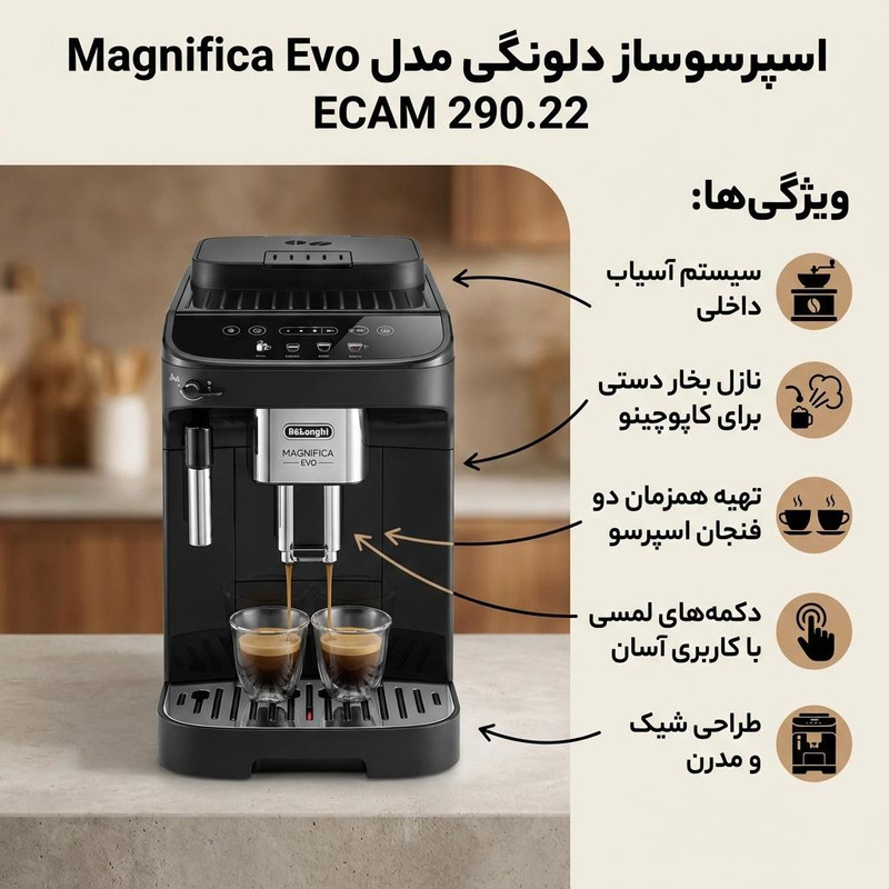 دلونگی 290.22 دارای توان مصرفی 1450 وات و فشار بخار 15 بار بوده که موجب میشود با کیفیتترین نوشیدنیها را در کوتاهترین زمان سرو کنید. این اسپرسو ساز دارای کنترل پنلی لمسی و با کیفیت بوده که کار را برای مصرف کننده بسیار آسان میکند. یکی دیگر از قابلیتهای منحصر به فرد این دستگاه، آسیاب 14 حالته آن است. شما با توجه به نوشیدنی که میخواهید سرو کنید، میتوانید درجه آسیاب را مناسب همان نوشیدنی تنظیم کنید. دستگاه دارای مخزن آسیاب با ظرفیت 250 گرم و مخزن آب با ظرفیت 1.8 لیتر بوده که حجم قابل توجهی از دانه قهوه و آب را در خود جای میدهد. این دستگاه با کمک یک نازل بخار دستی شیر، کف شیر خامه ای را برای نوشیدنی های مبتنی بر شیر مورد علاقه شما تولید میکند. شما همچنین میتوانید آب گرم را برای یک فنجان چای یا سایر دم نوشها از دستگاه بگیرید. سینی چکهگیر این دستگاه از جنس استیل ضد زنگ بوده که به راحتی قابل جدا شدن و شستشو است. اسپرسو ساز دلونگی Magnifica Evo ECAM 290.22 دستگاهی اتوماتیک برای دوستداران نوشیدنیهای کافئیندار و ایتالیایی است. این اسپرسو ساز دارای یک آسیاب قهوه یکپارچه با 14 درجه آسیاب است که به شما امکان میدهد آسیاب مورد نظر را برای نوشیدنی مورد علاقه خود انتخاب کنید. علاوه بر این، این دستگاه امکان استفاده از قهوه از قبل آسیاب شده را نیز ارائه میدهد.