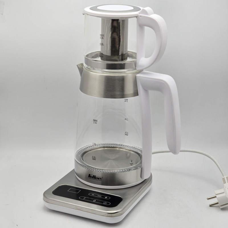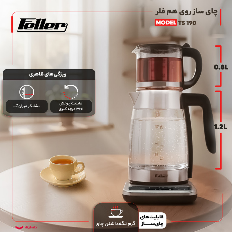 چای ساز روی هم فلر مدل TS 190 دستگاهی خوشساخت و مدرن است که با طراحی ترکیبی استیل و شیشه و کنترل لمسی پیشرفته، فرآیند دم کردن چای و دمنوش را ساده و دقیق میکند. این مدل از نوع روی هم طراحی شده و قوری روی دهانه کتری قرار میگیرد تا بخار آب جوش، حرارت یکنواختی برای دم آوری ایجاد کند. این شیوه به حفظ طعم، رنگ و عطر طبیعی چای کمک میکند و نوشیدنی نهایی را خوشطعمی و دلنشین میسازد.