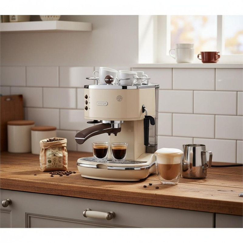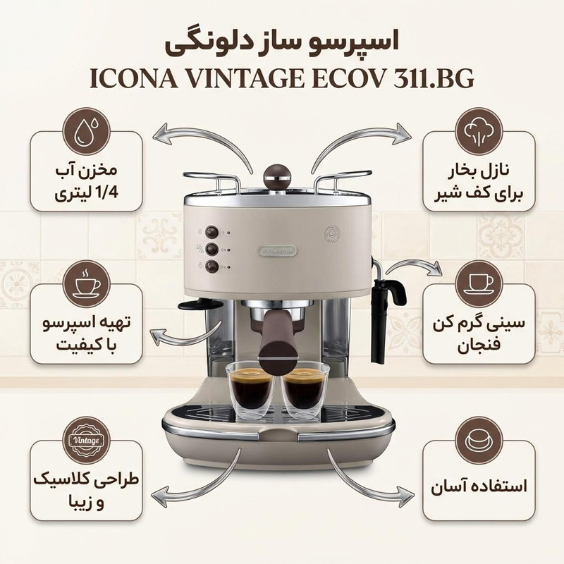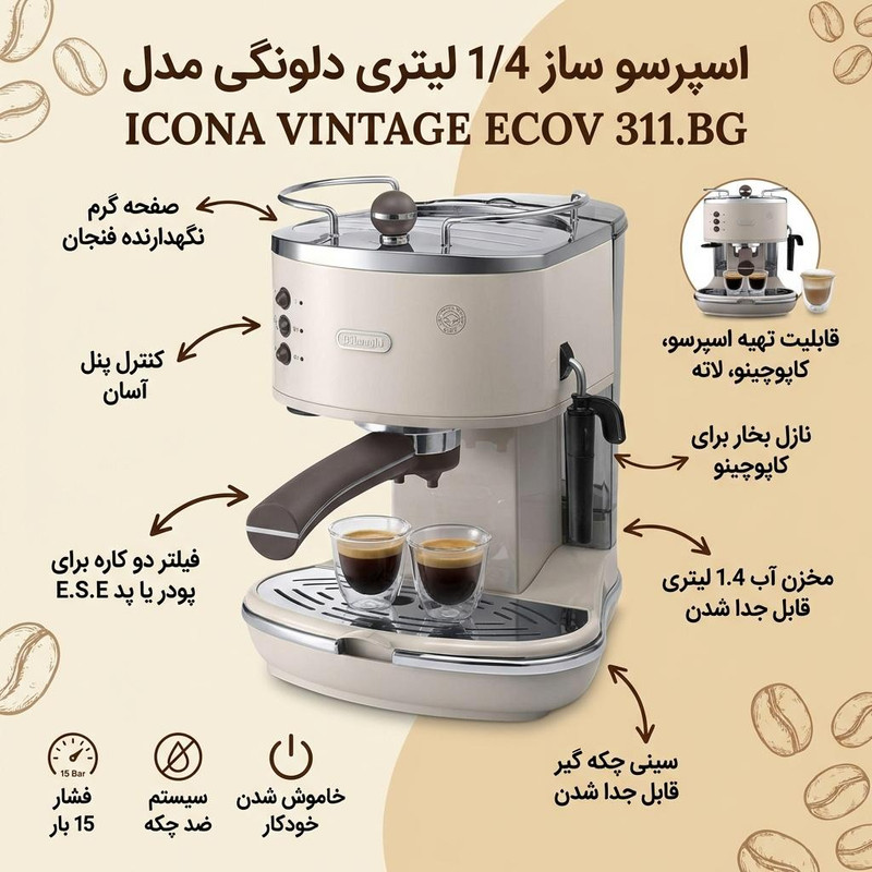 اسپرسوساز دلونگی مدل Icona Vintage یک دستگاه با پنل شیک با تکنولوژی پیشرفته که برای شما تهیه یک اسپرسوی ایتالیائی کامل را تضمین میکند. همچنین سیستم کاپوچینو ساز با مخلوط بخار و شیر یک فوم غنی و خامه ای برای شما درست میکند.این دستگاه با قابلیت فیلتر دو سطحی و گرم کن فنجان می باشد.