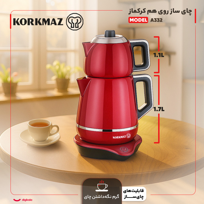همچنین برای چای ساز کد A332 کرکماز سیستم گرم نگه دار طراحی شده و هنگامی که دستگاه را روی این حالت قرار دهید چای شما برای مدت طولانی تری گرم خواهد ماند. کتری چای ساز دارای 1.7 لیتر ظرفیت بوده و می توانید در هر بار استفاده تا 30 فنجان چای را آماده کرده و از مهمانهای خود با چای خوش رنگ و طعمی پذیرایی کنید.