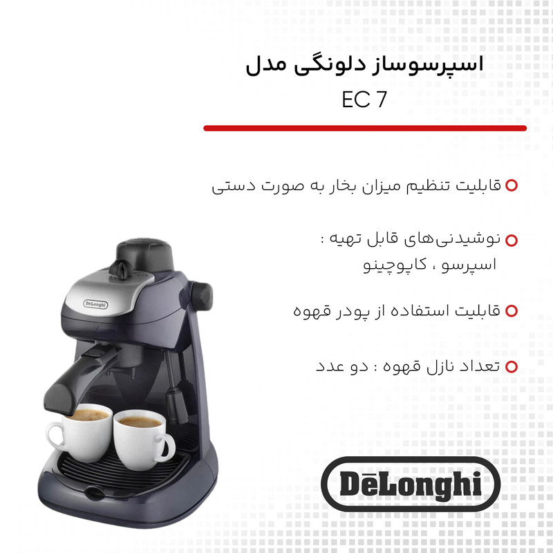 اسپرسوساز «دلونگی» (Delonghi) مدل «EC7»، محصولی ساده، سبک و زیباست که توسط شرکت دلونگی تولید شده است. دلونگی یکی از سردمداران تولید اسپرسوساز و قهوهساز در جهان است. اسپرسوساز EC7 دارای دو خروجی است و به کمک آن میتوانید برای یک یا دو نفر همزمان قهوه آماده کنید البته ظرفیت دستگاه تا 4 فنجان است. این دستگاه میتواند در سه غلظت مختلف اسپرسو تهیه کند و قابلیت تهیه کاپوچینو هم دارد. یکی از مزیتهای بزرگ این دستگاه امکان تهیهی کف شیر با فشار بخار است. فقط کافی است شیر سرد را داخل لیوان بریزید و زیر نازل بخار قرار دهید تا کف شیر درست شود. با دکمهی چرخشی که در کنار دستگاه تعبیه شده است، میتوان فشار بخار را نیز تنظیم کرد. این محصول مجهز به سیستم واریو برای انتخاب طعم دلخواه از قهوهی ملایم تا قهوهی غلیظ است. فنجانها روی سینی چکهگیر قرار میگیرند تا در صورت چکیدن آب پس از برداشتن فنجانها، دستگاه یا میز کثیف نشود. با این محصول تهیهی دو فنجان قهوه بهراحتی انجام میگیرد تا بتوان با همصحبت خود قهوه ای میل کرد و از مصاحبت لذت برد. دلونگی شرکتی ایتالیایی است که بیش از 100 سال قدمت دارد. این شرکت در زمینههای مختلفی ازجمله لوازمخانگی برقی مانند غذاساز، مایکروویو و مخلوطکن فعالیتهای گستردهای را در سراسر جهان انجام میدهد؛ همچنین کیفیت ساخت محصولات این شرکت بیشازپیش، تضمین شده است.