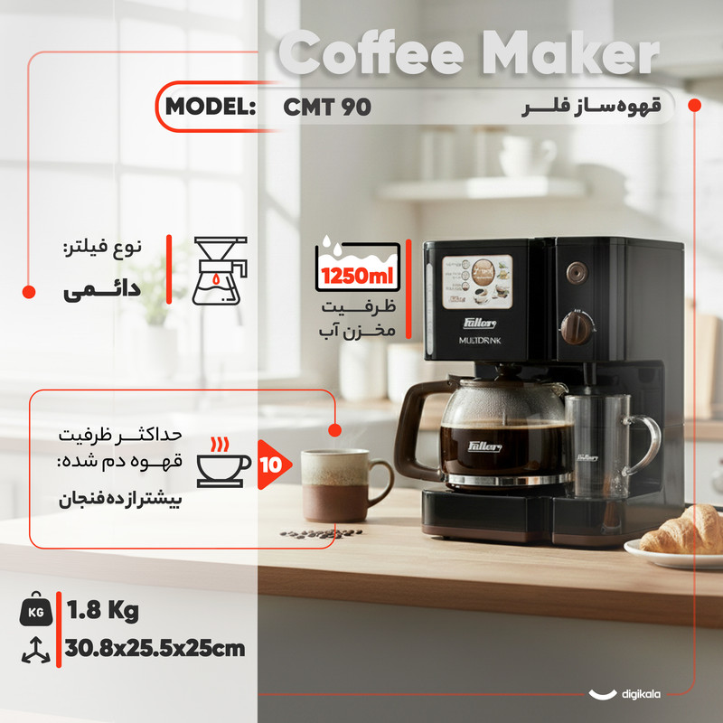 قهوهساز فلر مدل CMT 90 از فیلتر دائمی بهره میبرد که استفاده از فیلتر کاغذی جداگانه را غیرضروری میکند و به کاهش هزینههای جانبی کمک میرساند. قوری شیشهای با طراحی شفاف، امکان مشاهده میزان قهوه دمشده را فراهم میکند و ظرفیت کافی برای سرو چند فنجان همزمان دارد. صفحه گرم نگهدارنده قهوه از امکانات ویژه این مدل است که دمای نوشیدنی را برای مدتزمان مناسب حفظ میکند و کیفیت طعم قهوه را ثابت نگه میدارد.