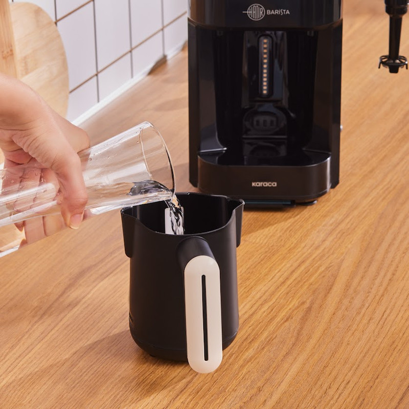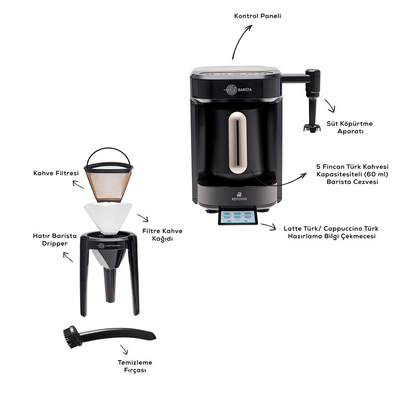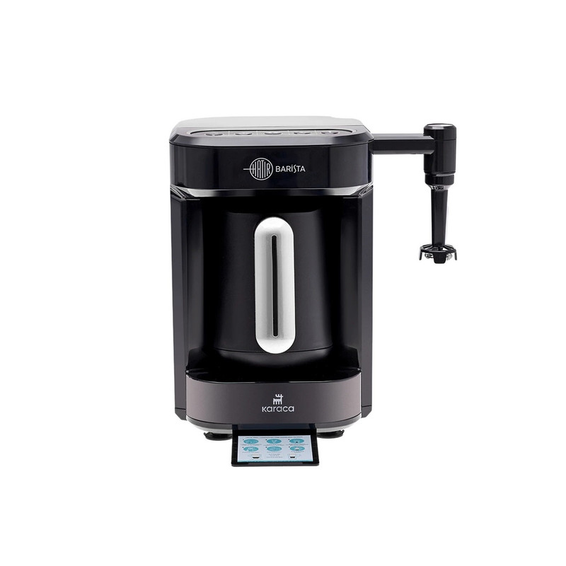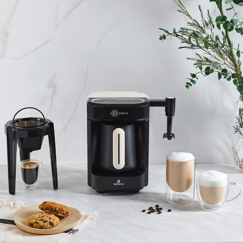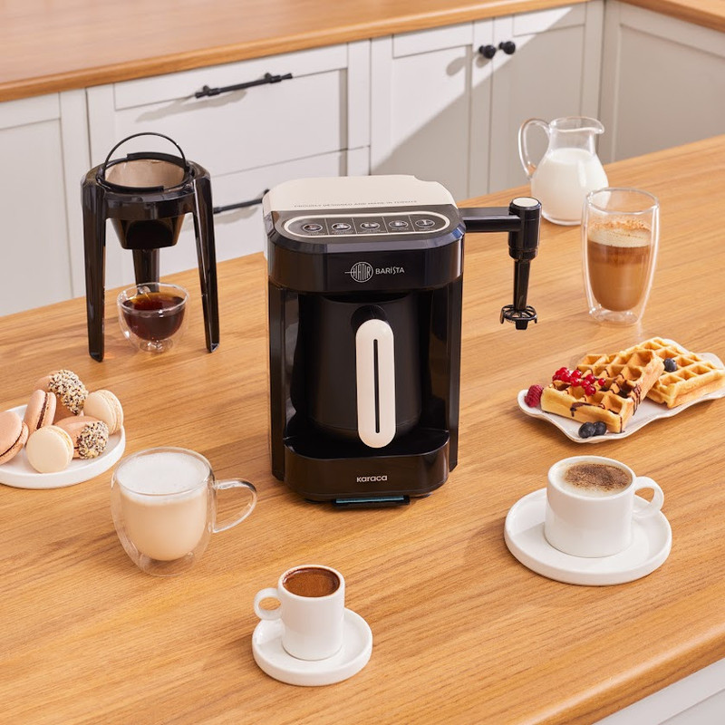 قهوه ساز 5 کاره کاراجا مدل Barista Türk از محبوب ترین و پرفروش ترین محصولات برند کاراجا محصول کشور ترکیه می باشد.با این قهوه ساز هیچ محدودیتی برای باریستای خانه خود ندارید به راحتی می توانید انواع قهوه اعم از لاته، کاپاچینو ،قهوه بو داده و قهوه ترک را با شیر بدون دردسر هر لحظه در خانه یا محل کار آماده و میل نمایید.هر بار می توانید برای پنج نفر معادل 300 میلی لیتر قهوه تهیه کرده و از عزیزان و مهمانان خود پذیرایی کنید .به کمک فوم ساز در کنار کاراجا باریستا میتوان شیر را به کف مورد نظر خود رساند .کاراجا باریستا دارای فیلتر و پایه جهت تهیه قهوه فرانسوی را دارد .کارکردن با دستگاه کاراجا باریستا خیلی راحت و آسان می باشد به دلیل اینکه تمام نوشیدنی ها و کارکرد ها روی دستگاه دکمه و علامت دارد .قهوه ساز پنج کاره باریستا مجهز به دستگاه فوم ساز نیز می باشد در حالی که می توانید برای تمام نوشیدنی های شیر خود فوم های غلیظی را با دستگاه کف ساز شیر تهیه کنید.قهوه جوش باریستا با دهانه مخصوص که دارد به شما کمک می کند مانند یک باریستای متخصص قهوه های خود را در فنجان بریزید.تمیزکاری این قهوه ساز باریستا کاراجا با برس تمیزکننده مخصوص خیلی آسان و راحت است.در ضمن کاراجا باریستا دارای سیستم هوشمند است تنها با آب خالی کار نمیکند باید همراه قهوه باشد تا دستگاه شروع به کار میکند