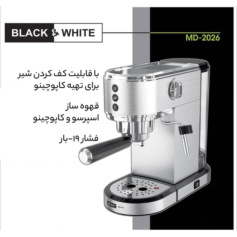 اسپرسو ساز بلک اند وایت با فشار 20 بار بخار جز دستگاه های خانگی لوکس یا نیمه صنعتی به شمار می رود جنس بدنهی این دستگاه از استیل ضد زنگ است که علاوه بر جذابیت، طول عمر و کیفیت بیشتری خواهد داشت. با این دستگاه میتوانید تمامی قهوههای فوم دار را تهیه کنید و از صفحه گرم کننده فنجان کمک بگیرید تا فنجان قهوه را برای سرو نوشیدنی مورد نظر خود گرم کنید. نازل بخار این دستگاه قهوه را می توان برای تهیه فوم شیر استفاده کرد. نازل قهوه ی این دستگاه ساخته شده از استیل است که هیچ ضرری برای سلامتی شما ندارد و هیچ مواد سمی ای را وارد شیر یا قهوه نمی کند و همچنین قابل شستشو و بادوام است.پرتافیلتر این اسپرسوساز دارای کیفت ساخت بالا می باشد که دارای سبد استیل و یک دستگیره از جنس چوب راش با روکش باکالیت نسوز با رنگ مشکی می باشد.این محصول با یک سبد سینگل، یک سبد دابل و یک تمپر در اختیار شما عزیزان قرار میگیرد. از دیگر ویژگی های این محصول می توان به سیستم قطع خودکار، دماسنج، سیستم شست و شوی خودکار و کم مصرف بودن این دستگاه اشاره کرد.