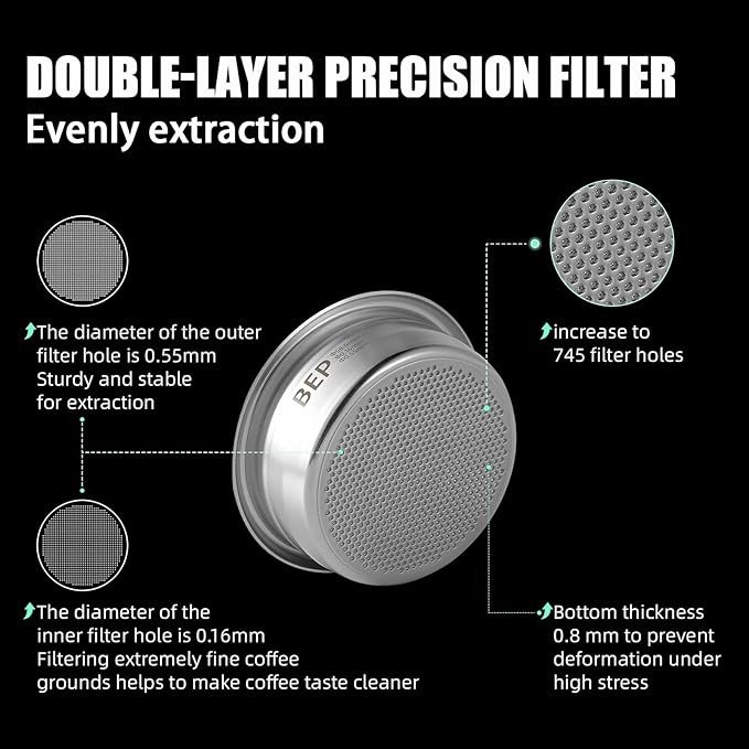 در مورد این مورد 【فیلتراسیون دو لایه】 سبد فیلتر اسپرسو ارتقا یافته دارای طراحی دو لایه است. فیلتر داخلی از فرار ذرات بسیار ریز جلوگیری می کند، در حالی که فیلتر بیرونی راندمان استخراج را افزایش می دهد و از مش داخلی پشتیبانی می کند. 【استخراج دقیق】با 745 سوراخ سوراخ شده با لیزر، سبد فیلتر اسپرسو BEP ما استخراج یکنواخت تری را تضمین می کند و خلوص و شیرینی اسپرسو را افزایش می دهد. 【58.5mm پایه】طراحی شده برای کار یکپارچه با انواع پورتافیلترهای دستگاه اسپرسوساز 58 میلی متری موجود در بازار، سازگار با Breville (BES980XL، BES920XL، BES900XL)، Gaggai (Classic، Pro، Evo)، Bezzera All Machines، و همه دستگاههای Bezzera E6، از جمله ECM، Rancilio، Rocket، VBM و دیگران. 【بادوام و طولانی مدت】 سبد فیلتر پورتافیلتر کاملاً از فولاد ضد زنگ SUS304 مواد غذایی ساخته شده است که مقاومت در برابر خوردگی و اکسیداسیون را ارائه می دهد. کف کاسه پودر با ضخامت 0.8 میلی متر تقویت شده است که از تغییر شکل تحت فشار بالا جلوگیری می کند. 【طعم قهوه تقویتشده】 طعم قهوه تقویتشده: طراحی صاف و صاف ارتقا یافته، استخراج یکنواخت و پایدار را ترویج میکند و از تعامل یکنواخت بین مایع و تفالههای قهوه اطمینان میدهد. مناسب برای پورتافیلتر قهوه 2.3 اینچی (58.5 میلی متر).