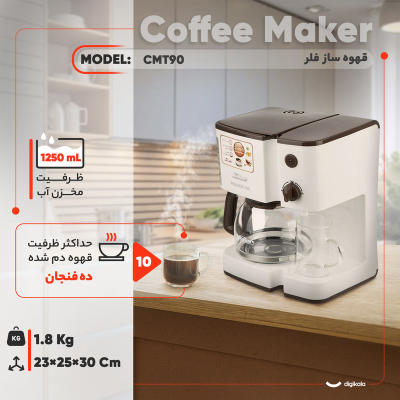 قهوهساز «فلر» مدل «CMT 90» یک محصول برقی کارآمد از این شرکت است که برای تهیهی قهوهی معمولی از پودر قهوه استفاده میکند. بدنهی قهوهساز از پلاستیک مستحکم و باکیفیت ساخته شده است که با قوری شفاف شیشهای همراه شده است. این قهوهساز در رنگهای متنوعی تولیدشده و بهراحتی میتوانید آن را با هر آشپزخانهای هماهنگ کنید. برای این دستگاه دو لیوان هم در نظر گرفته شده که یکی شیشهای و دیگری سرامیکی است. قوری این قهوهساز 1250 میلیلیتر گنجایش دارد. روی بدنهی پلاستیکی قهوهساز نوار نیمهشفاف باریکی قرار گرفته که میزان آب موجود در مخزن آب دستگاه را به شما نشان میدهد.