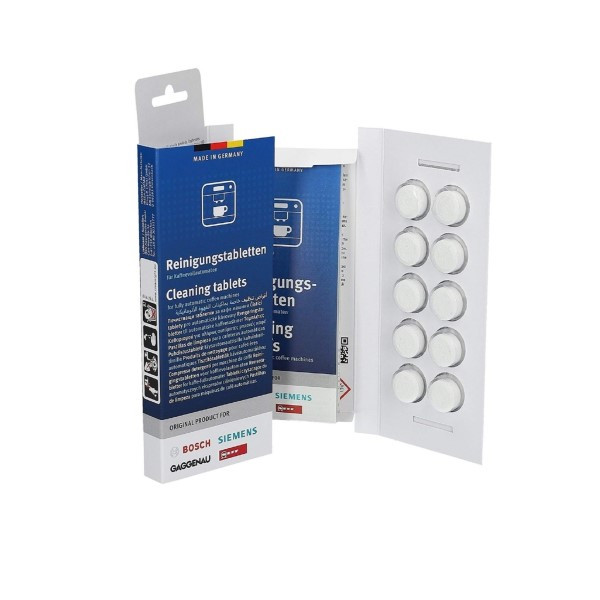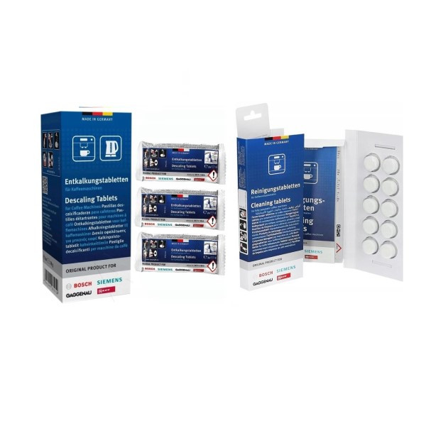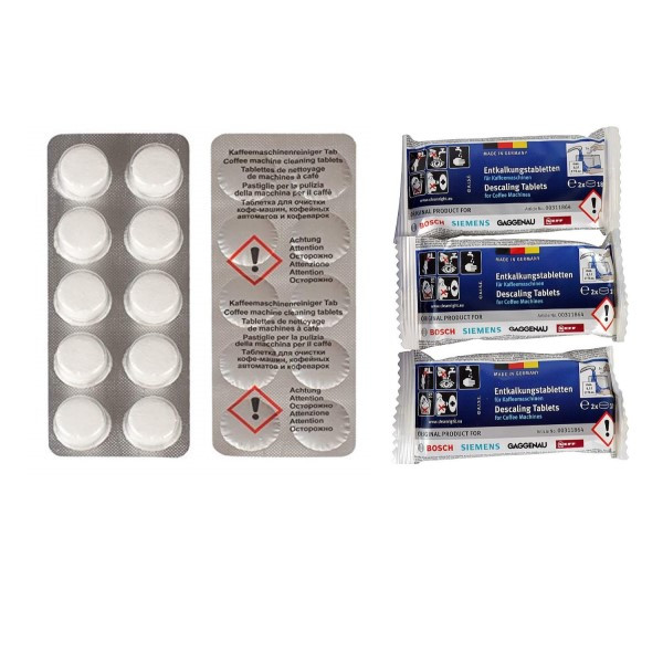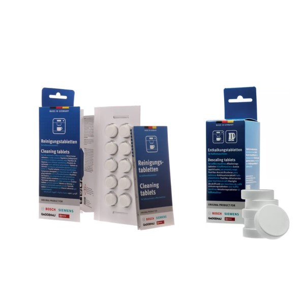 پک قرص جرمگیر اسپرسوساز بوش ، شامل یک بسته قرص شش عددی Descaling ، برای رسوب زدایی مخزن آب و مجرای آب قهوه ساز بوده به همراه یک بسته ده عددی قرص جرمگیر Cleaning برای جرمگیری قسمت قهوه دستگاه اسپرسوساز می باشد . این قرص های ساخت کشور آلمان بوده و تاریخ تولید آنها کمتر از شش ماه میباشد .