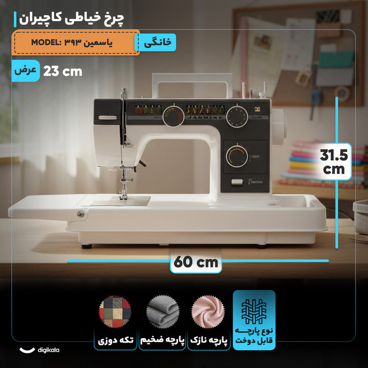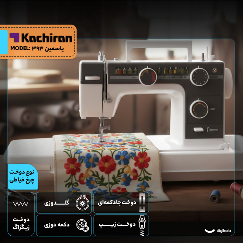 امکانات چرخ خیاطی: سیستم نخقطعکن خودکار , اهرم فشار پایه , اهرم کشش نخ