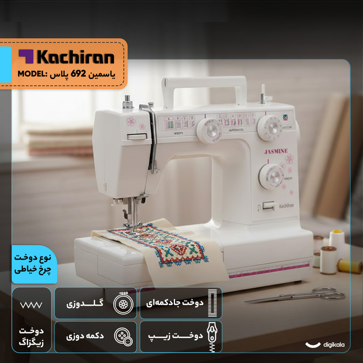 پایه دوخت , دفترچه راهنما , پدال , برس پرزگیر , بشکاف درز , پایه جادکمهدوزی , پایه زیپدوزی , سوزن