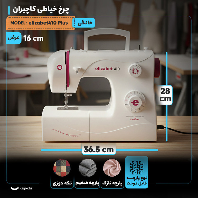 امکانات چرخ خیاطی: سوزننخکن خودکار , اهرم کشش نخ , بازوی آزاد