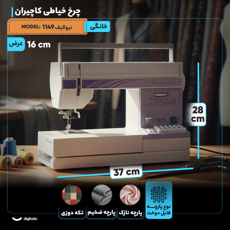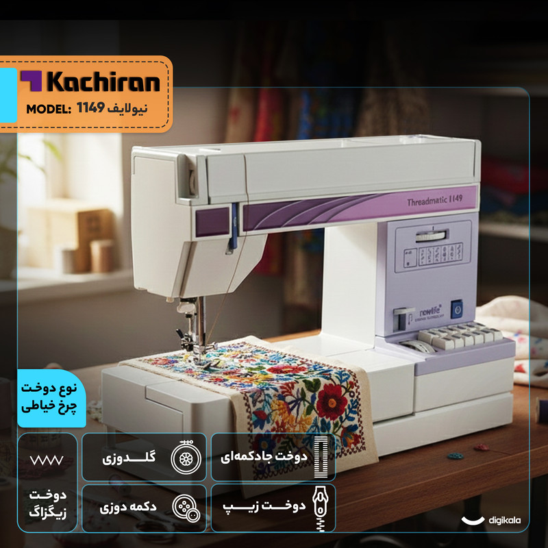 امکانات چرخ خیاطی: بازوی آزاد , اهرم فشار پایه , سیستم نخقطعکن خودکار , اهرم کشش نخ , سوزننخکن خودکار