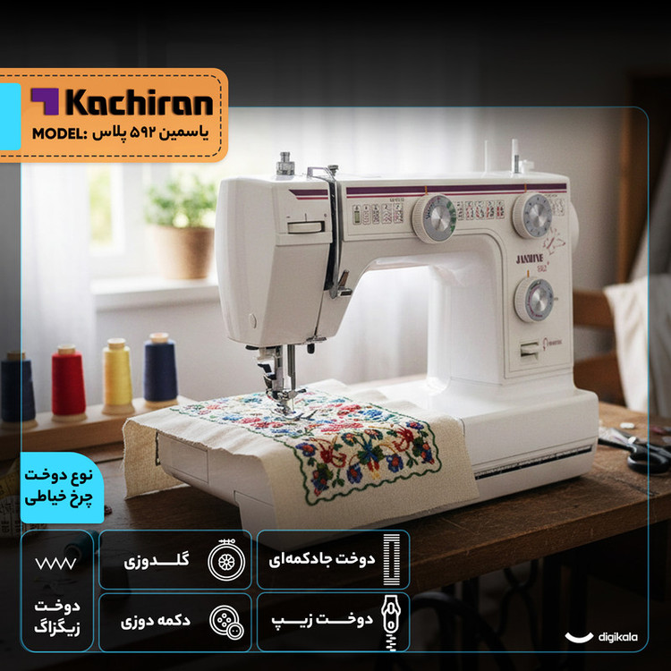 امکانات چرخ خیاطی: بازوی آزاد , سوزننخکن خودکار , سیستم نخقطعکن خودکار , اهرم فشار پایه