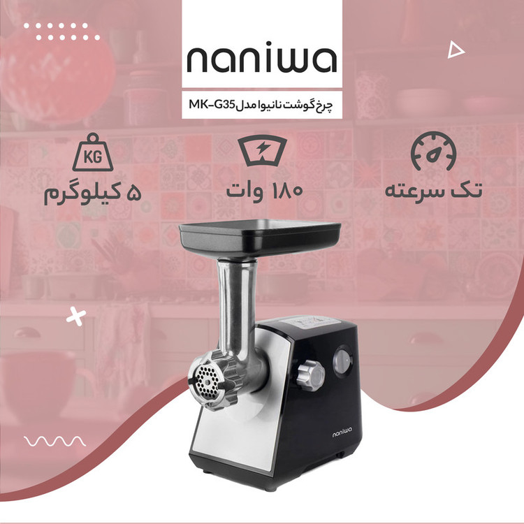 چرخ گوشت، تك كاره، نانيوا، مدل MK-G35، سازنده توليدي لوازم خانگي نانيوا، ايران، تك سرعته، بدون نمايشگر، توان مصرفي 180 W، جنس بدنه پلاستيكي