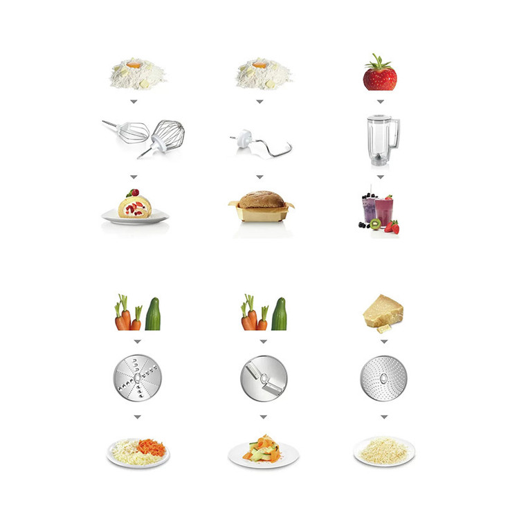 کنترل سرعت الکترونیکی ست شیرینی پزی برای دستیابی به نتایج بینظیر شامل: 1- سری همزن حرفهای انعطافپذیر 2- سری تخممرغ زن حرفهای با قابلیت تنظیم ارتفاع 3 - سری خمیرزن حرفه ایی با محافظ دنده