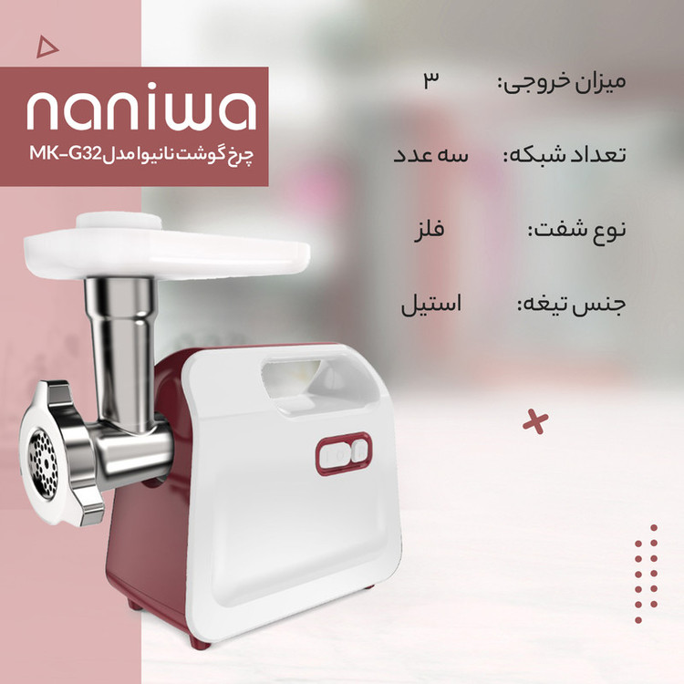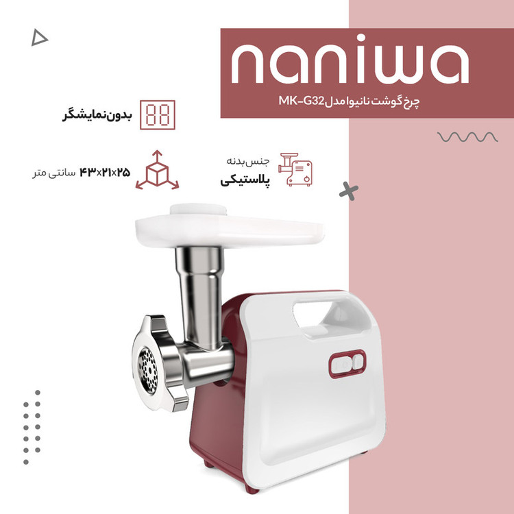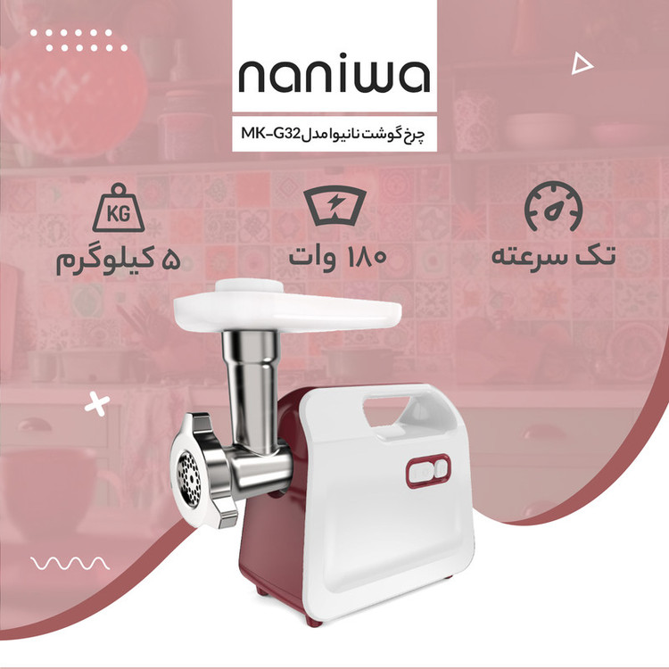 سایر اقلام همراه محصول: چرخ گوشت، تك كاره برند نانيوا، مدل MK-G32،تولیدات از سازنده توليدي لوازم خانگي نانيوا، ايران، تك سرعته، بدون نمايشگر، توان مصرفي 180 W، جنس بدنه پلاستيكي