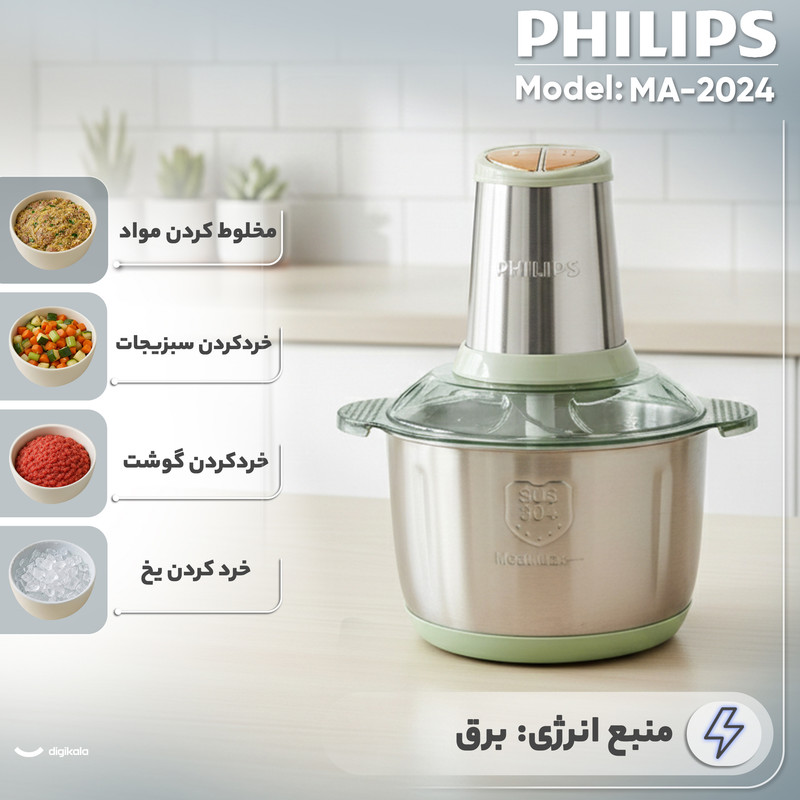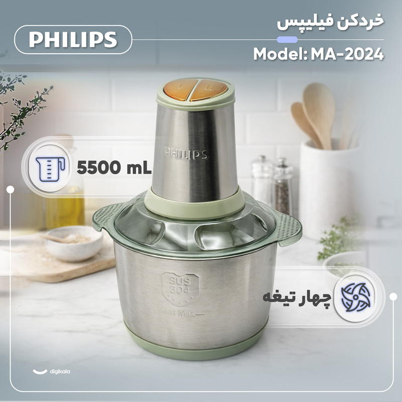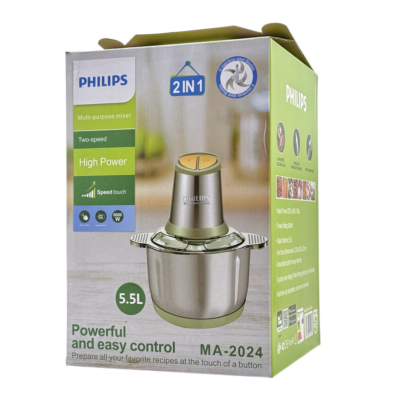 خردکن ۵.۵ لیتری فیلیپس مدل MA-2024 با بهرهگیری از طراحی حرفهای، عملکرد قدرتمند و ساختار مقاوم، گزینهای قابل اعتماد برای آمادهسازی سریع و دقیق مواد غذایی در آشپزخانههای مدرن محسوب میشود. این دستگاه با وزن تنها ۱.۲ کیلوگرم، در کنار بدنهای تماماستیل، ترکیبی از سبکی، استحکام و ظاهر شکیل را ارائه میدهد و بهراحتی با سایر تجهیزات آشپزخانه هماهنگ میشود.