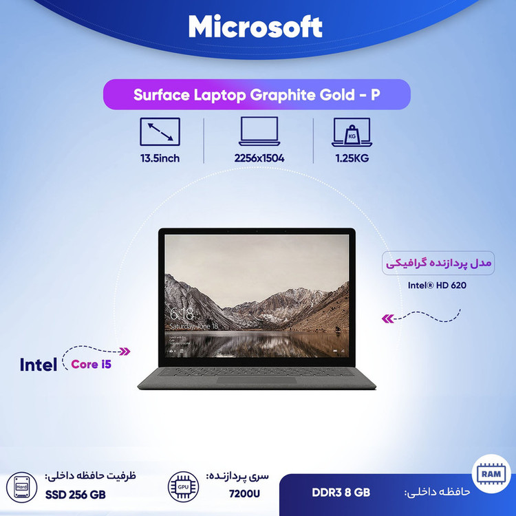 لپ تاپ 13 اینچی مایکروسافت مدل Surface Laptop Graphite Gold - P به همراه ماوس مایکروسافت مدل 2017 Arc Mouse Silver و کیف 13 اینچ وایو برزنتدر کنفرانس می 2017 مایکروسافت همهچیز طبق پیشبینیها بود و محصولاتی که همگان از قبل انتظار داشتند یکی پس از دیگری معرفی میشدند. اما در یک سوم پایانی کنفرانس ناگهان از محصولی رونمایی شد که تمامی حضار را غافلگیر کرد؛ لپتاپ مایکروسافت به نام Surface Laptop. این لپتاپ 13.5 اینچی یک ترکیب بینظیر از طراحی زیبا و خلاقانه درکنار سختافزارهای قدرتمند است. صفحهنمایش کمنظیر این محصول از نوع لمسی با پنل IPS و روکش براق است که وضوح تصویری متفاوت برابر با 2256x1504 پیکسل دارد. با وجود براقبودن روکش، باز هم این صفحهنمایش زاویهی دید بالایی دارد و حتی در محیطهای خارجی هم میتوان تصاویر را با شفافیت بالایی روی آن مشاهده کرد. نکتهی جذاب دیگر دربارهی این محصول وجود روکش محافظ صفحهنمایش Corning Gorilla Glass 3 است که از خط و خش و ضربات احتمالی و آسیبدیدن صفحهنمایش جلوگیری میکند. با این حال میتوان به جرات Surface Laptop را یکی از بهترین لپتاپهای ویندوزی محسوب کرد. نسل هفتم پردازندههای سری Core i5 و Core i7 اینتل، حافظه داخلی SSD و 8 تا 16 گیگابایت رم، از جمله عوامل قدرتمندبودن این دستگاه هستند. پردازشگر گرافیکی این محصول در دو گزینه آنبرد Intel HD 620 یا Iris™ Plus Graphics 640 بدون حافظهی مجزا موجود است. این مدل که در حال حاضر نمونهی میانرده در بین مدلهای Surface Laptop محسوب میشود، با پردازنده مرکزی Core i5 7200U، رم 8 گیگابایتی، 256 گیگابایت حافظهی داخلی SSD و پردازشگر گرافیکی Iris™ Plus Graphics 620 ارائه میشود. کاربرانی که قصد اجرای برنامههای نیمهحرفهای و البته تا حدودی حرفهای را داشته یا میخواهند بازیهای کامپیوتری را با کیفیت قابل قبولی بازی کنند، این مدل میتواند انتخاب مناسبی برای آنها باشد. باتری این دستگاه تا 14.5 ساعت شارژ نگه میدارد و برای کاربری روزمره و پوشش یک روز کامل کاری مناسب است. پورتهای ورودی و خروجی زیادی روی دستگاه مشاهده نمیشود که عبارتند از یک پورت USB 3.0، یک پورت Mini DisplayPort، کارتخوان و جک 3.5 میلیمتری صدا که همهی آنها در اطراف لپتاپ قرار گرفتهاند.