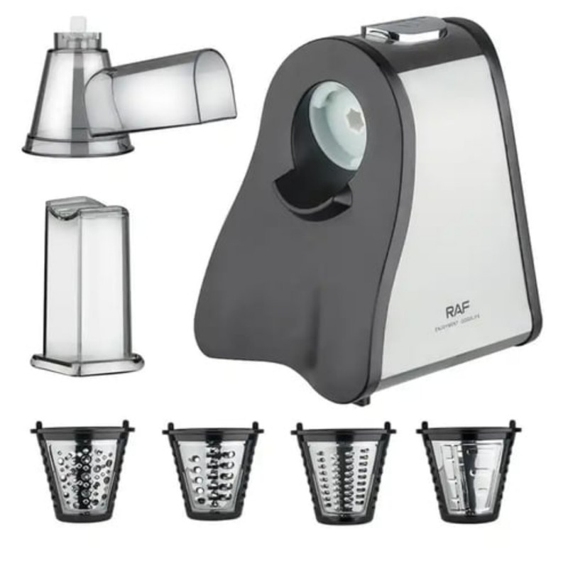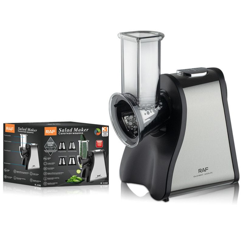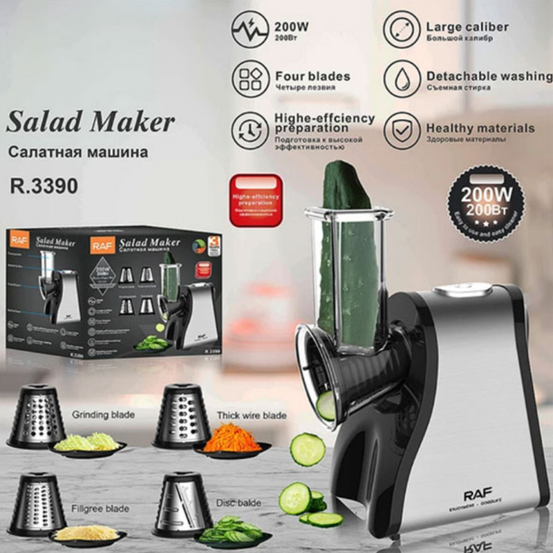 سالاد سازها می توانند با سرعتی معین سبزیجات را به یک سایز برش دهند، در واقع این وسایل برادر کوچک غذا سازها می باشند. طراحی سالاد سازها (رنده برقی) به گونه ای است که در همان نگاه اول می توان طرز کار با آن را یاد گرفت و با توجه به سایز دهانه ورودی دستگاه می توان از آن برای برش زدن و قطعه کردن انواع مواد غذایی استفاده کرد. کمپانی راف با در نظر گرفتن این نیاز، سالاد سازی تولید کرده است که با آن میتوان انواع مواد غذایی را با 4 دیسک خود که برای آن در نظر گرفته است برش زد. این سالاد ساز دارای 4 دیسک برای برش رشته ای نازک، ضخیم، خلال و رنده یا آسیاب می باشد. یکی از مزایای مهم در این نوع سالاد ساز قدرت موتور، جنس و نوع تیغه های آن می باشد، موتور این سالاد ساز با توان 200 وات بوده که برای انجام اموری ساده نظیر خردکن موادغذایی از توانی کافی برخوردار است. همچنین موتور این دستگاه دارای تنظیمات سرعت به صورت فشاری می باشد و جنس تیغه ها نیز از استیل ضد زنگ می باشند و زمانی که با قدرت موتور بالا ترکیب می شوند توانایی خرد کردن انواع مواد غذایی را دارند. همچنین این سالاد ساز قابلیت جدا سازی قطعات دارد و پس از کار می توان تک تک اجزای آن را شسته و از تمیزی آن اطمینان خاطر داشت.