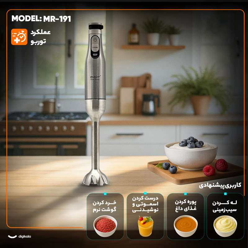 کاربری پیشنهادی: درست کردن اسموتی و نوشیدنی , خرد کردن گوشت نرم , خرد کردن یخ , پوره کردن غذای داغ