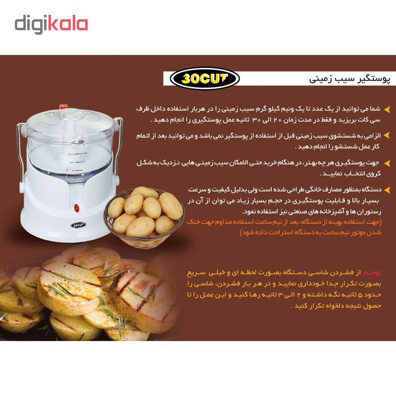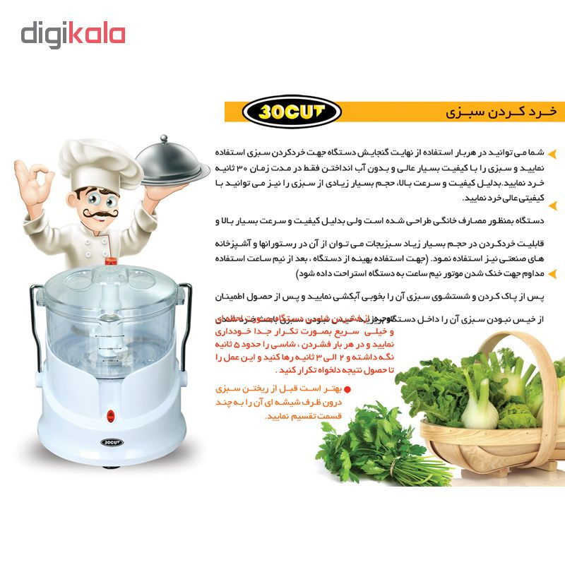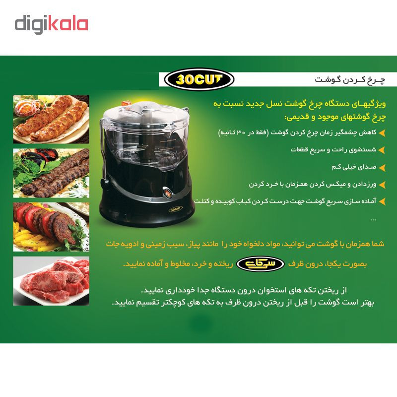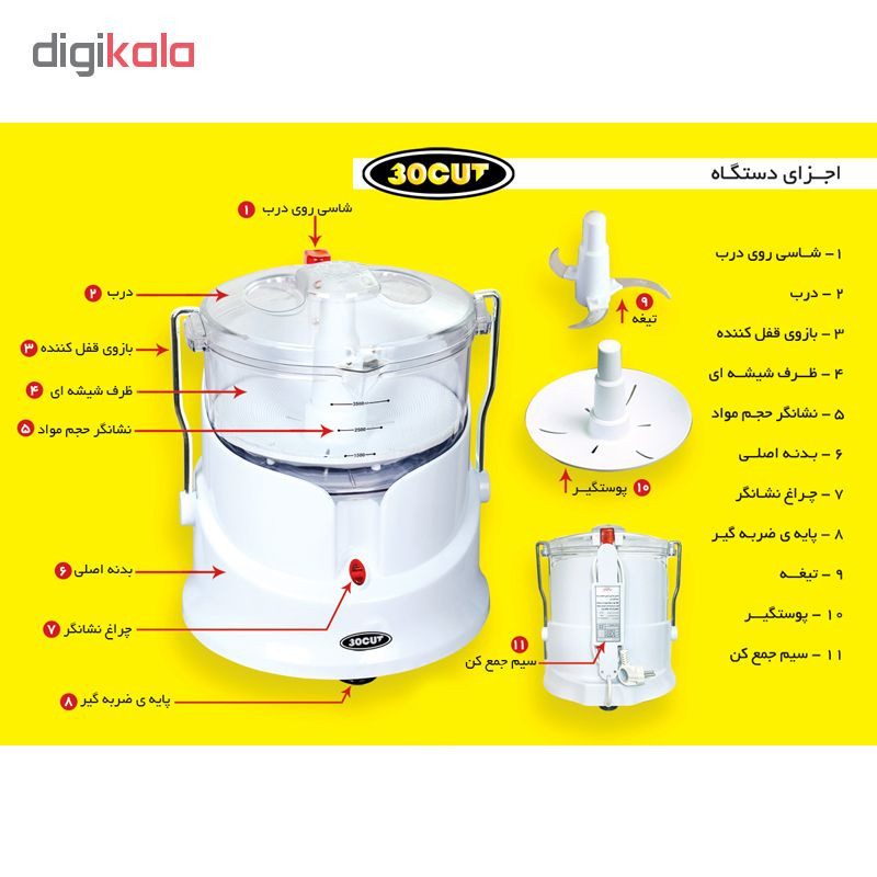 چرخ کردن گوشت،پوست گیر،خرد کردن سبزیجات 30cut محصولی چند کاره دارای بدنه و موتور بسیار با کیفیت می باشد. از این کالا می توان برای چرخ کردن گوشت، خرد کردن سبزیجات، میکس انواع مواد، پوست کردن سیب زمینی، آماده کردن انواع نوشیدنی و دسرها، کالباس خانگی، الویه و ... استفاده نمود. دستگاه چرخ گوشت و غذا ساز 30cut دارای استاندارد و گواهی نامه ثبت اختراع است.تیغه های فولادی ضد زنگ، سرعت بالا، موتور پر قدرت اورجینال, شتشوی آسان و استاندارد CE اروپا از دیگر خصوصیات آن به شمار می رود.محصول در دو رنگ مشکی و سفید موجود است.