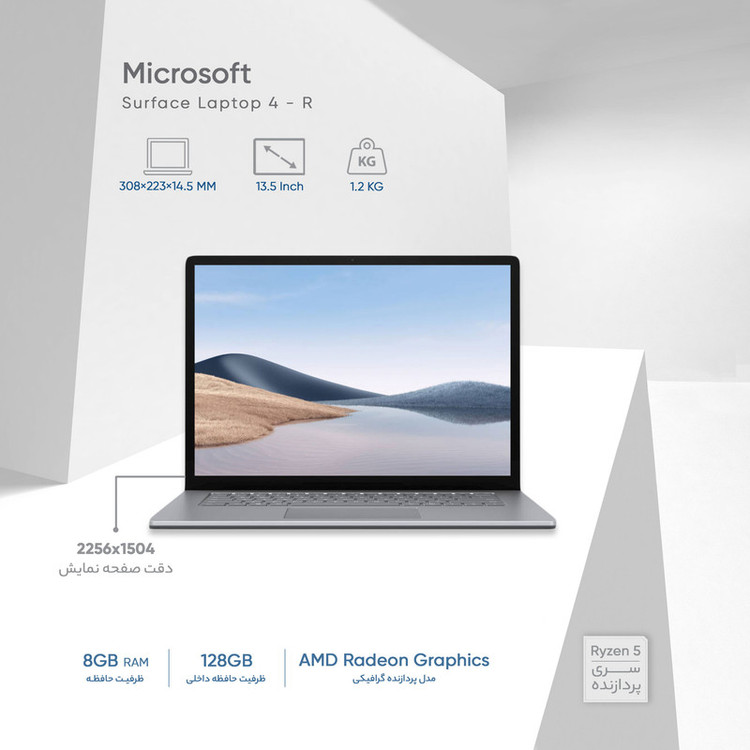 شرکت مایکروسافت طی چند سال گذشته از لپ تاپهای سری سرفیس خود رونمایی کرد و تا امروز تعداد زیادی از این سری لپ تاپها روانهی بازار شدهاند. شرکت مایکروسافت با تولید این لپ تاپها به وضوح به دنبال ارائهی یک محصول شیک و بسیار جذاب از نظر ظاهری بوده و علاوه بر آن، کیفیت بدنهی این لپ تاپها هم زبانزد هستند و آنها را از بسیاری از لپ تاپهای موجود در بازار متمایز میکند. لپ تاپ مایکروسافت مدل Surface Laptop 4 - R از جمله محصولات پرطرفدار از این سری است و از مشخصات سختافزاری جالب توجهای بهره میبرد. این لپ تاپ به پردازندهی مرکزی شرکت AMD مدل Ryzen 5 4680U مجهز شده و در کنار این پردازنده 8 گیگابایت رم از نوع LPDDR4X برای آن در نظر گرفته شده است. این لپ تاپ فاقد حافظهی گرافیکی مجزا بوده و تنها 128 گیگابایت حافظهی داخلی SSD در آن تعبیه شده است. نمایشگر این لپ تاپ به عنوان یکی از نقاط قوت اساسی آن در نظر گرفته میشود. این نمایشگر از نسبت تصویر 3:2 و وضوح 2256x1504 بهره میبرد و شاهد کیفیت تصویر فوقالعاده بالایی در نمایشگر این لپ تاپ 13.5 اینچی هستیم.