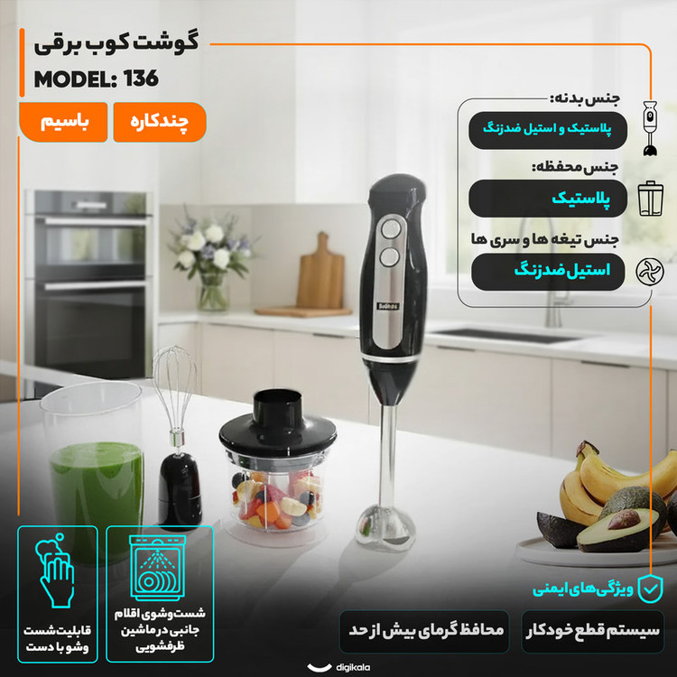 کاربری پیشنهادی: پوره کردن غذای داغ , درست کردن اسموتی و نوشیدنی , خرد کردن گوشت نرم , خرد کردن سبزی , خرد کردن یخ , له کردن سیبزمینی