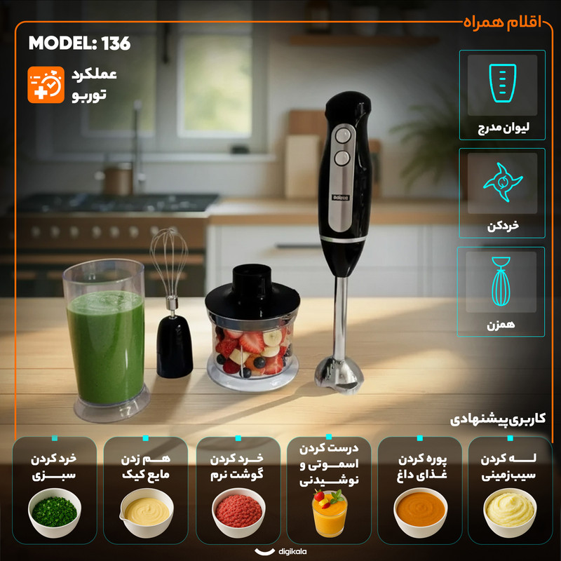 کاربری پیشنهادی: پوره کردن غذای داغ , درست کردن اسموتی و نوشیدنی , خرد کردن گوشت نرم , خرد کردن سبزی , خرد کردن یخ , له کردن سیبزمینی
