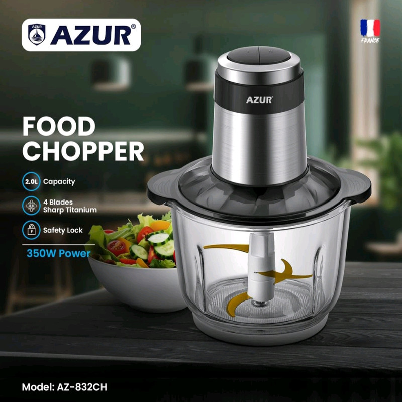 خردکن آزور مدل AZ-832CH دارای موتور قدرتمند مسی با توان 350 وات و گیربکس کاملا فلزی که به چهار تیغه تیتانیوم بسیار تیز متصل است ظرف این خردکن از جنس شیشه با ظرفیت 2 لیتر است