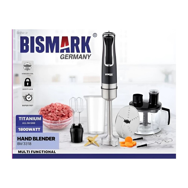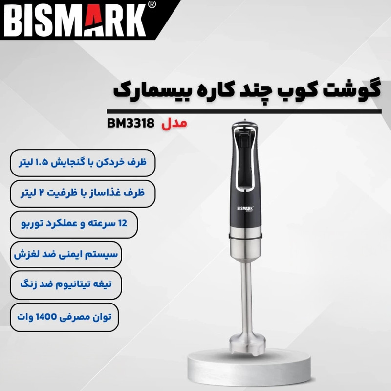 گوشتکوب برقی چندکاره بیسمارک مدل BM3318 دستگاهی قدرتمند با توان ۱۴۰۰ وات است که برای له کردن و مخلوط کردن انواع مواد غذایی طراحی شده است. این محصول با ۱۲ سرعت قابل تنظیم و عملکرد توربو، امکان تنظیم دقیق سرعت و قدرت را به شما میدهد تا با سرعت و سهولت بالا بتوانید مواد سخت و نرم را به راحتی خرد کنید. تیغههای تیتانیومی ضد زنگ این گوشتکوب با دوام و مقاومت بالا در برابر سایش و زنگزدگی، عملکردی ماندگار و با کیفیت ارائه میدهند. موتور گیربکس قدرتمند دستگاه نیز تضمینکننده عملکرد بهینه و طول عمر بیشتر محصول است.