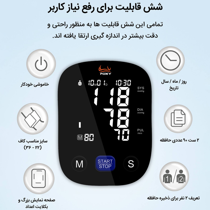 قابلیت اعلان صوتی , حافظه ذخیره نتایج , نمایش میانگین نتایج , اندازهگیری فشار خون , اندازهگیری ضربان قلب