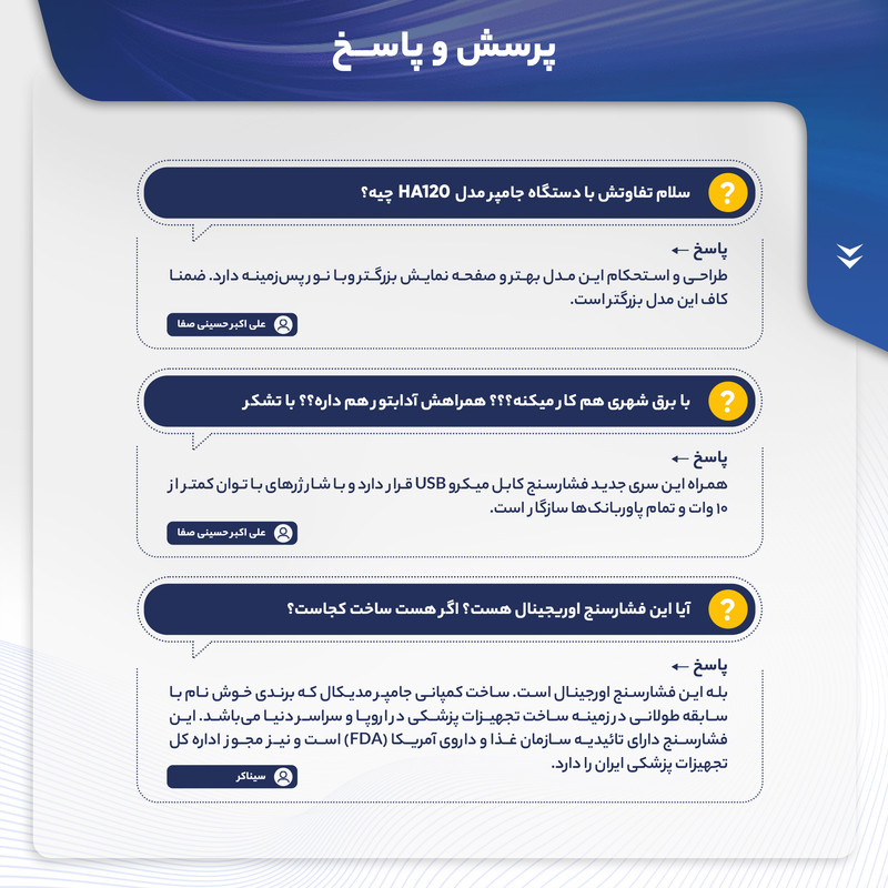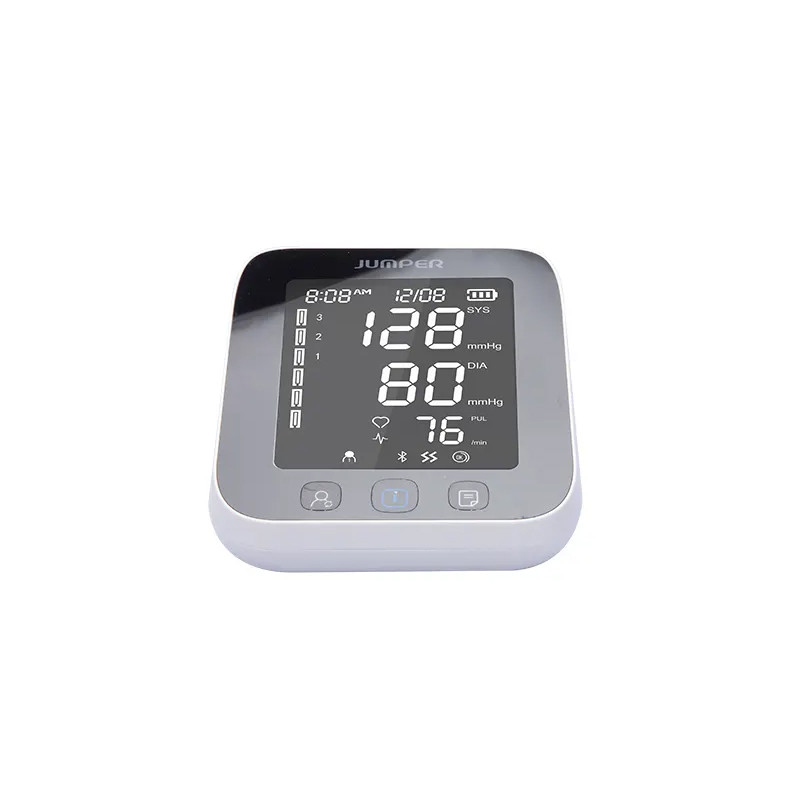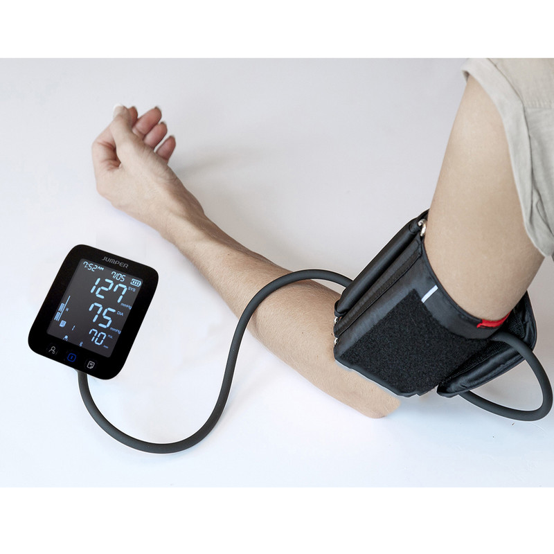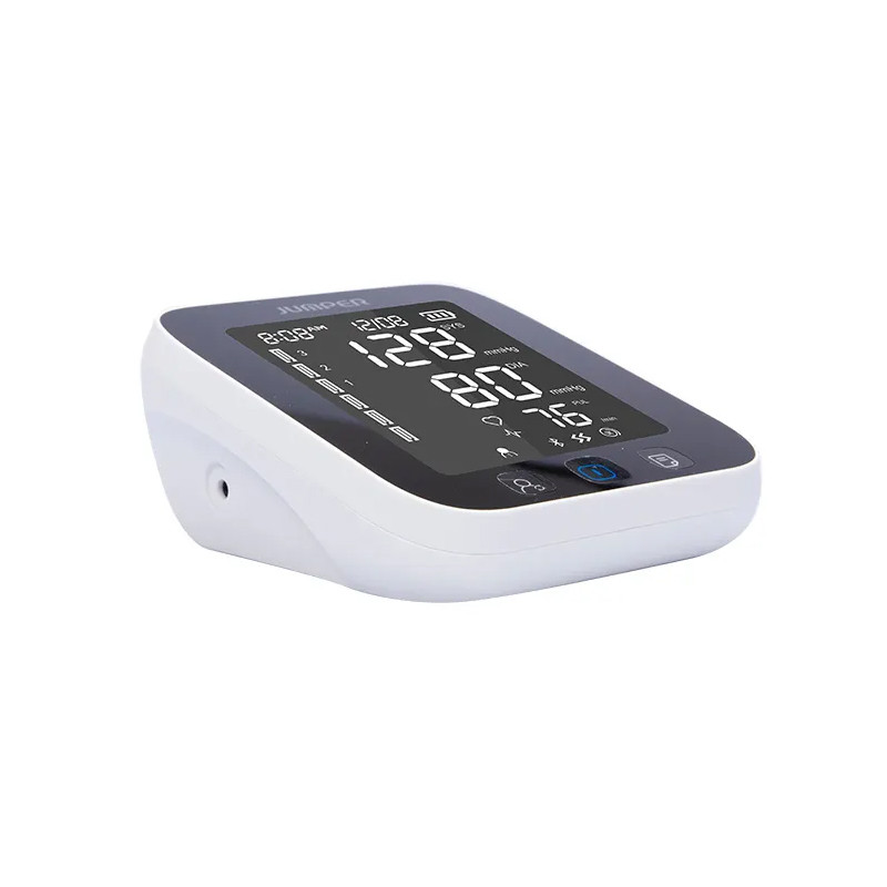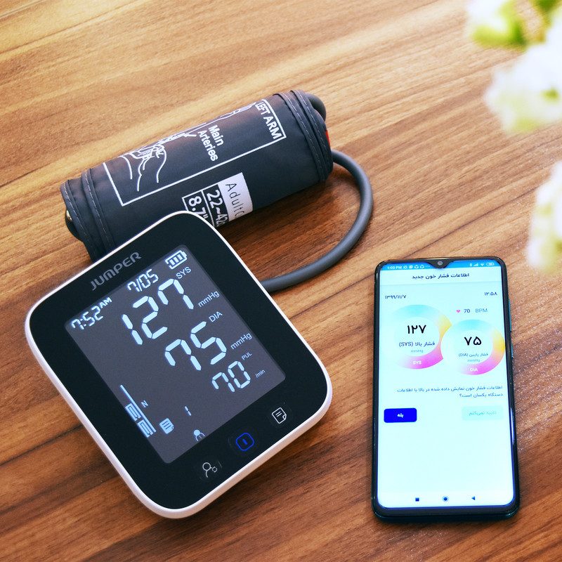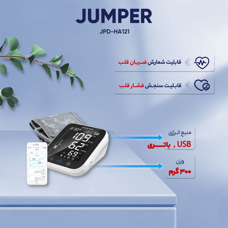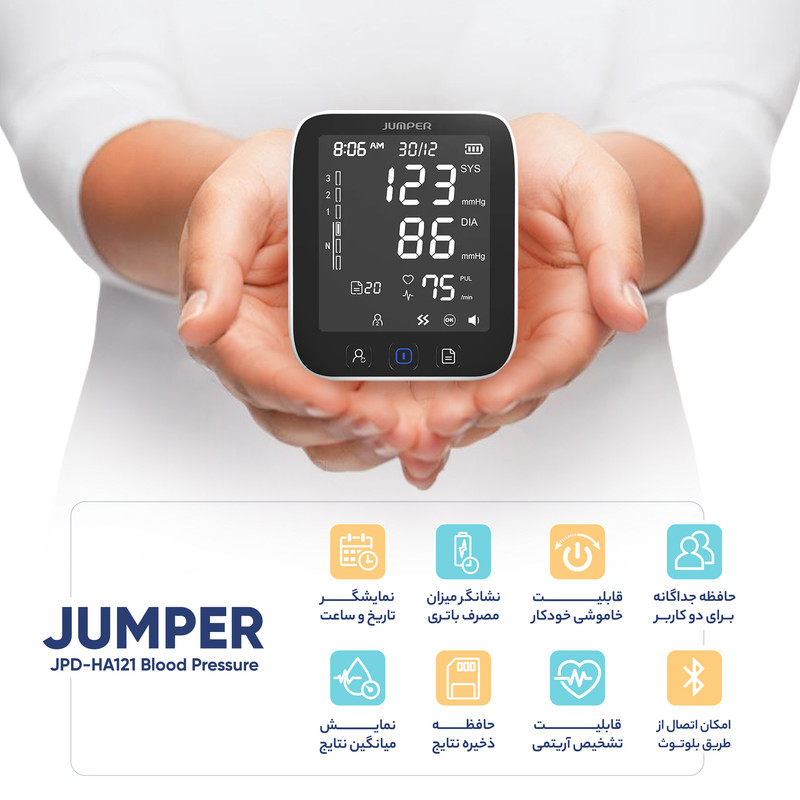 اندازهگیری فشارخون به طور مداوم و بررسی روند تغییرات فشارخون، یکی از گامهای اساسی برای جلوگیری از ابتلا به فشارخون بالا به شمار میرود. به کمک فشارسنج جامپر مدل JPD-HA121 میتوانید میزان فشار بالا و پایین خون و ضربان قلب را به دقت اندازهگیری کرده و به کمک فناوری بلوتوث در موبایل همراه خود ذخیره کنید. ثبت خودکار این نتایج در نرمافزار فارسی سیناکِر (SinaCare) و نیز اپلیکیشن انگلیسی Jumper Health (هم اندروید و هم IOS) به شما کمک میکند تا تغییرات فشارخون خود را در قالب نمودارهای هفتگی و ماهانه بررسی کرده و از عوارض احتمالی مانند سکته جلوگیری کنید. این فشار سنج دارای تاییدیه FDA آمریکا، CE اروپا و استاندارد MDD93/42/EEC برای دستگاههای پزشکی است. این محصول دارای یک مانیتور LCD بزرگ و یک کیسه باد (کاف) است و فشارخون را به شکل دیجیتالی در زمان کوتاه و دقت بالا و کاملا خودکار محاسبه میکند. کاف این فشارسنج بازویی، مناسب دور بازو 22 تا 42 سانتیمتر است. شما میتوانید فشار ماکزیمم و مینیمم و تعداد ضربان قلب را به صورت جداگانه و میانگین نتایج را در دستگاه مشاهده کنید. منبع انرژی این دستگاه از طریق باتری و برق (از طریق کابل MicroUSB) تامین میشود و دارای قابلیت خاموش شدن اتوماتیک در صورت عدم استفاده پس از 1 دقیقه است. فشارسنج جامپر مدل JPD-HA121، با وزن 362 گرم و در ابعاد 63x138x120 میلیمتر به همراه 4 عدد باتری قلمی، بازوبند، دفترچه راهنما، کیف قابل حمل و کابل micro USB جهت استفاده به عنوان آداپتور، به خریداران ارائه میشود.