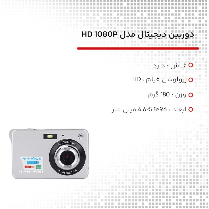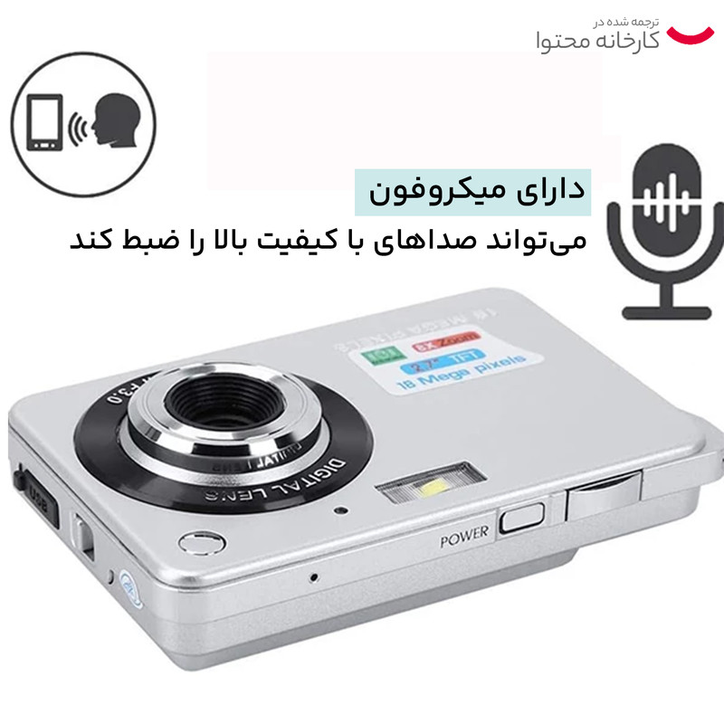 (دوربین دیجیتال مینی) 18 مگا پیکسل سنسور پیکسل 1/2.3 اینچی COMS 500 واتی، پشتیبانی از ضبط تصویر و فیلمبرداری. فرمت تصویر VGA و فرمت ویدئو AVI است.