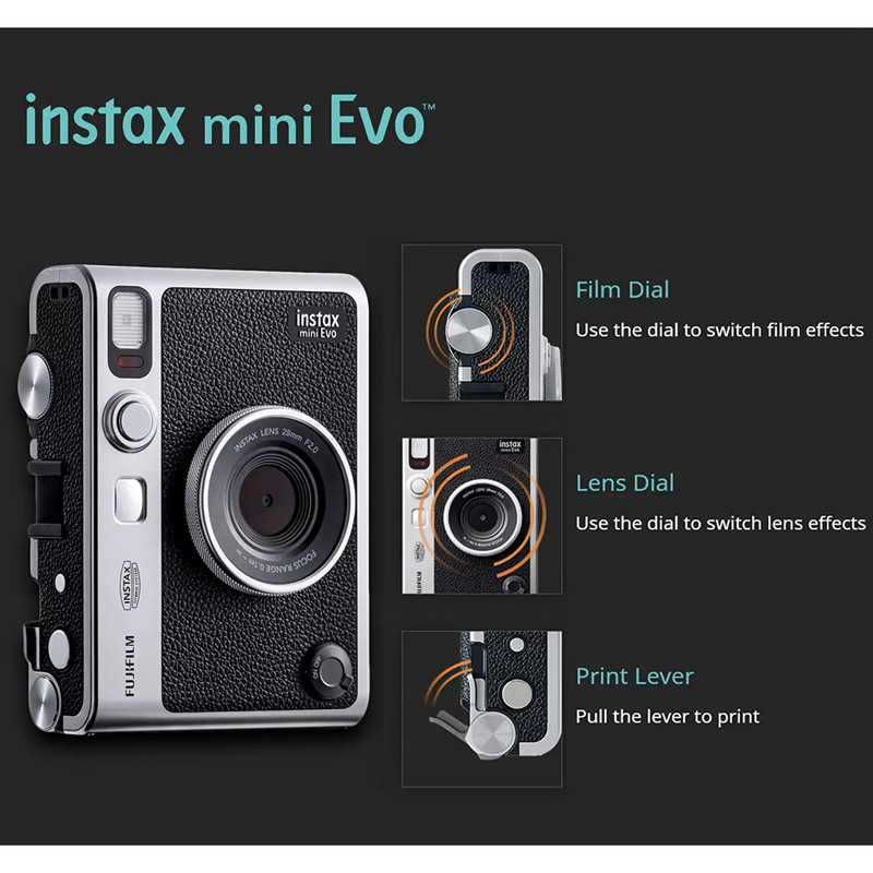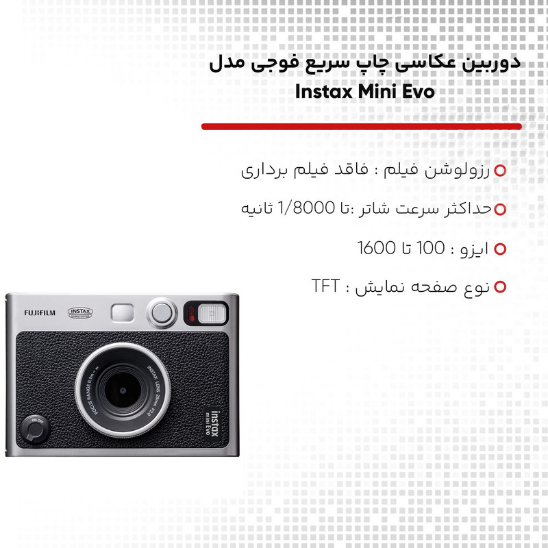 دوربینهای چاپ سریع یکی از دوربینهای پرطرفدار هستند که هنوز حس نوستالژیک عکسهای قدیمی را منتقل میکنند. این دوربین امکان چاپ لحظهای تصاویر را میدهد. مطرحترین برندی که در جهان این دوربین را تولید میکند، برند فوجی فیلم است. این برند جدیدترین محصول خود را تحت مدل Instax Mini Evo طراحی و روانه بازار کرده است. فوجیفیلم برای این مدل امکانات قابل توجهی را تعبیه کرده که یکی از مهمترین آنها قابلیت کنترل دوربین با گوشی موبایل است. این قابلیت این امکان را فراهم میسازد تا بتوان دستور تصویر برداری را با گوشی موبایل از راه دور به دوربین داد. همچنین امکان چاپ تصاویر گوشی موبایل از دیگر قابلیت مهم این مدل است. فوجیفیلم برای Instax Mini Evo از سنسور 1/5اینچی CMOS استفاده کرده که تصاویری با رزولوشن 2560x1920 را هم میتواند ثبت کند. لنز این مدل با دریچه دیافراگم F2.0 و فاصله کانونی 28 میلیمتری تصاویر باکیفیتی را ثبت خواهد کرد