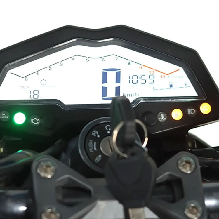 ترمزهای دیسکی جلو و عقب با سیستم ABS، کنترل مناسبی در شرایط بحرانی فراهم میکنند و نمایشگر دیجیتال نیز اطلاعات لازم مانند سرعت، کیلومترشمار و سطح سوخت را بهصورت دقیق نمایش میدهد. سیستم تعویض دنده ۶ سرعته و کلاچ دستی، تجربهی رانندگی حرفهایتری را برای راکب فراهم میسازد.