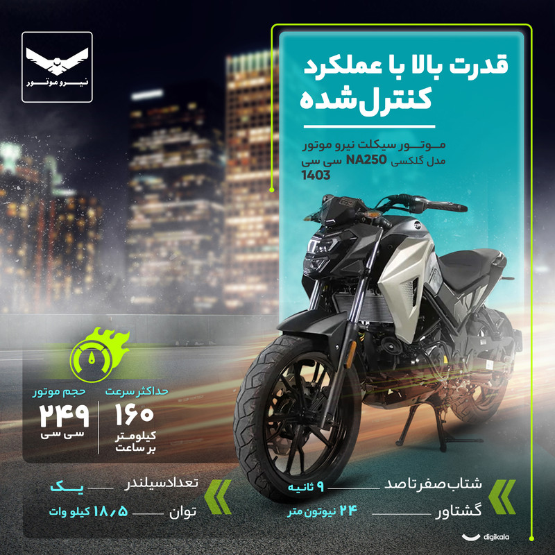 موتورسیکلت نیرو موتور مدل گلکسی NA250 سیسی سال ۱۴۰۳، یک گزینه شهری قدرتمند و اسپرت است که برای علاقهمندان به موتورسیکلتهای پرشتاب و مدرن طراحی شده است. این مدل با کلاس Street و طراحی عضلانی، مناسب افرادی است که علاوه بر کارایی، به ظاهر و عملکرد موتور نیز اهمیت میدهند.