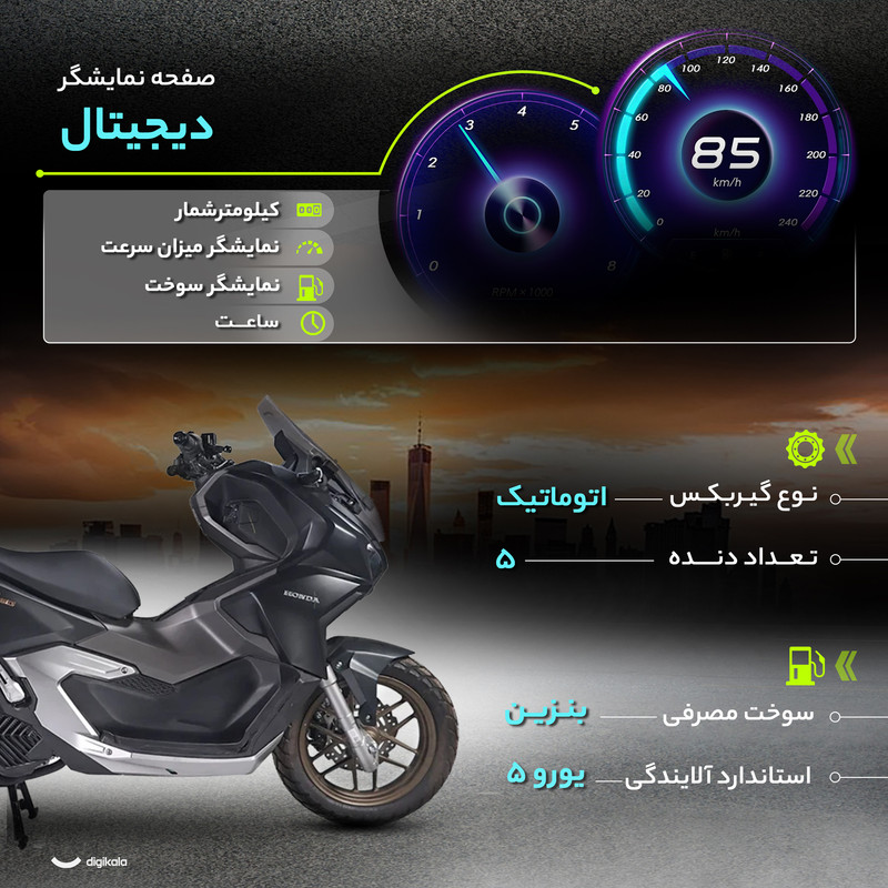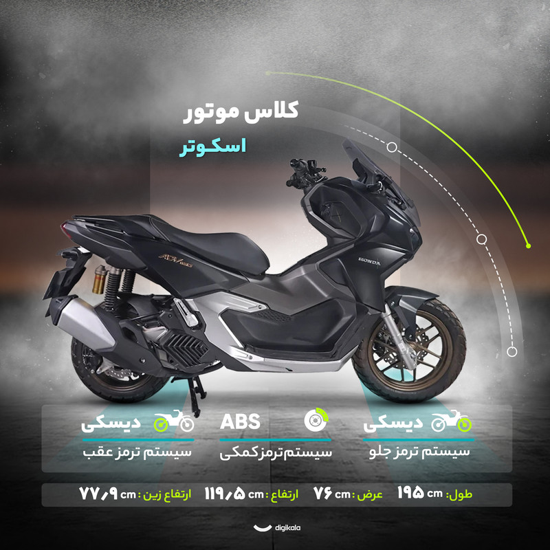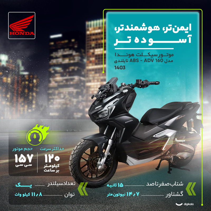 این اسکوتر از یک پیشرانه تک سیلندر ۱۵۷ سیسی با سیستم خنککننده آبی قدرت میگیرد که عملکردی پایدار را در شرایط مختلف تضمین میکند. موتور بنزینی آن توانی برابر با ۱۱.۸ کیلووات تولید کرده و با سیستم راهاندازی استارتی، به سرعت آماده حرکت میشود. ویژگی برجسته این مدل، شاسی توانمند آن است؛ سیستم تعلیق عقب با دو کمکفنر گازی، سواری باثبات و راحتی را در مسیرهای گوناگون فراهم میکند. ایمنی راکب نیز با بهرهگیری از ترمز دیسکی در هر دو چرخ و فناوری پیشرفته ضد قفل ABS به بالاترین سطح رسیده است. در نهایت، این ترکیب از عملکرد قدرتمند، ایمنی بالا و طراحی همهجارو، موتور سیکلت هوندا ADV 160 را به شریکی قابل اعتماد برای ماجراجوییهای روزمره تبدیل کرده است.