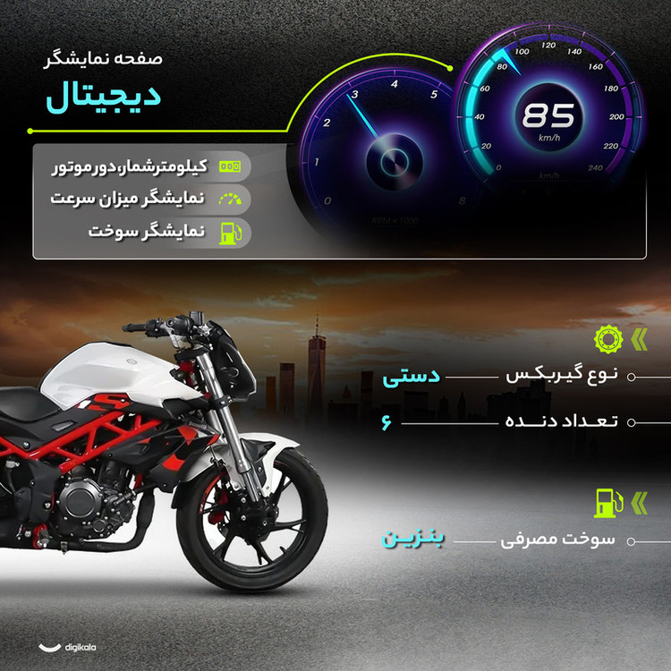 حداکثر سرعت این مدل به ۱۳۰ کیلومتر بر ساعت میرسد و با ظرفیت مخزن سوخت ۱۳.۵ لیتری، برای مسافتهای نسبتا طولانی مناسب است. صفحه نمایشگر دیجیتال اطلاعات ضروری مانند سرعت، دور موتور و میزان سوخت را به صورت دقیق به راننده نشان میدهد.