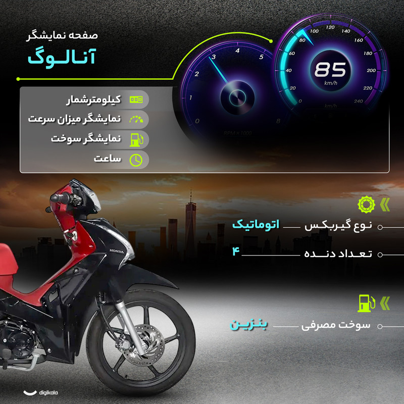 طراحی ساده، زین با ارتفاع مناسب (۷۵.۸ سانتیمتر)، ظرفیت باک ۸ لیتری و حداکثر سرعت تا ۱۱۰ کیلومتر بر ساعت از ویژگیهای مثبت این موتور هستند.