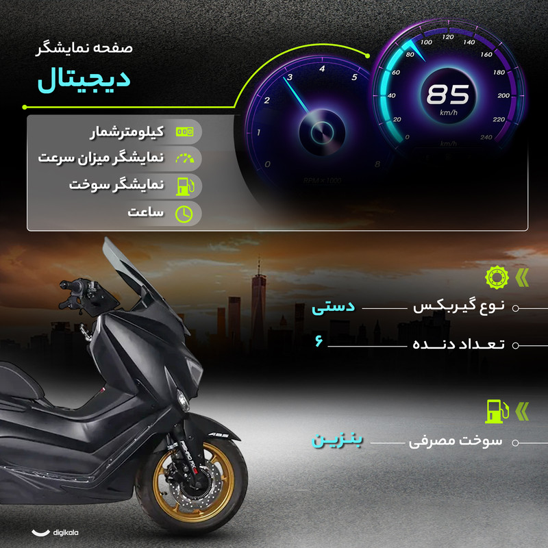 نمایشگر دیجیتال با امکاناتی چون نمایش سرعت، دور موتور و کیلومترشمار، اطلاعات کاملی در اختیار راکب قرار میدهد. از دیگر مزایای این مدل میتوان به چراغ جلوی LED، طراحی اسپرت، و آپشن کیلس استارتر اشاره کرد که کارایی و امنیت را ارتقا میدهد.